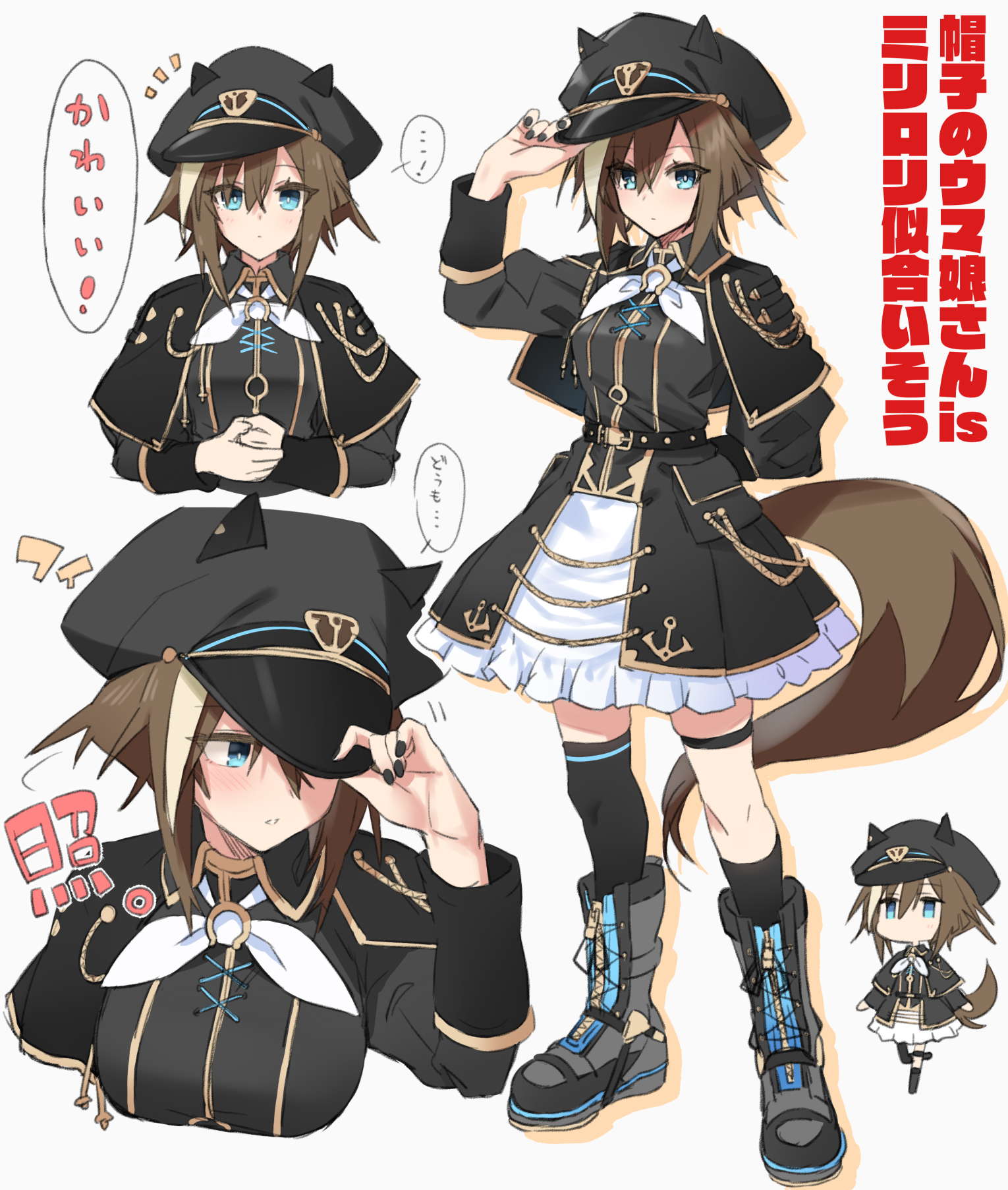 ! ... 1girl adjusting_clothes adjusting_headwear alternate_color animal_ears aqua_eyes asymmetrical_legwear black_capelet black_nails black_socks black_thighhighs boots brown_hair capelet cheval_grand_(umamusume) commentary_request ears_through_headwear eyes_visible_through_hair frilled_skirt frills grey_footwear hat highres horse_girl horse_tail horseshoe_ornament kneehighs light_brown_hair lolita_fashion military_lolita multiple_views nail_polish neckerchief no_mouth peaked_cap short_hair simple_background single_kneehigh single_sock single_thighhigh skirt socks spoken_ellipsis spoken_exclamation_mark starheart tail thighhighs translation_request turning_head umamusume uneven_legwear white_background white_neckerchief white_skirt
