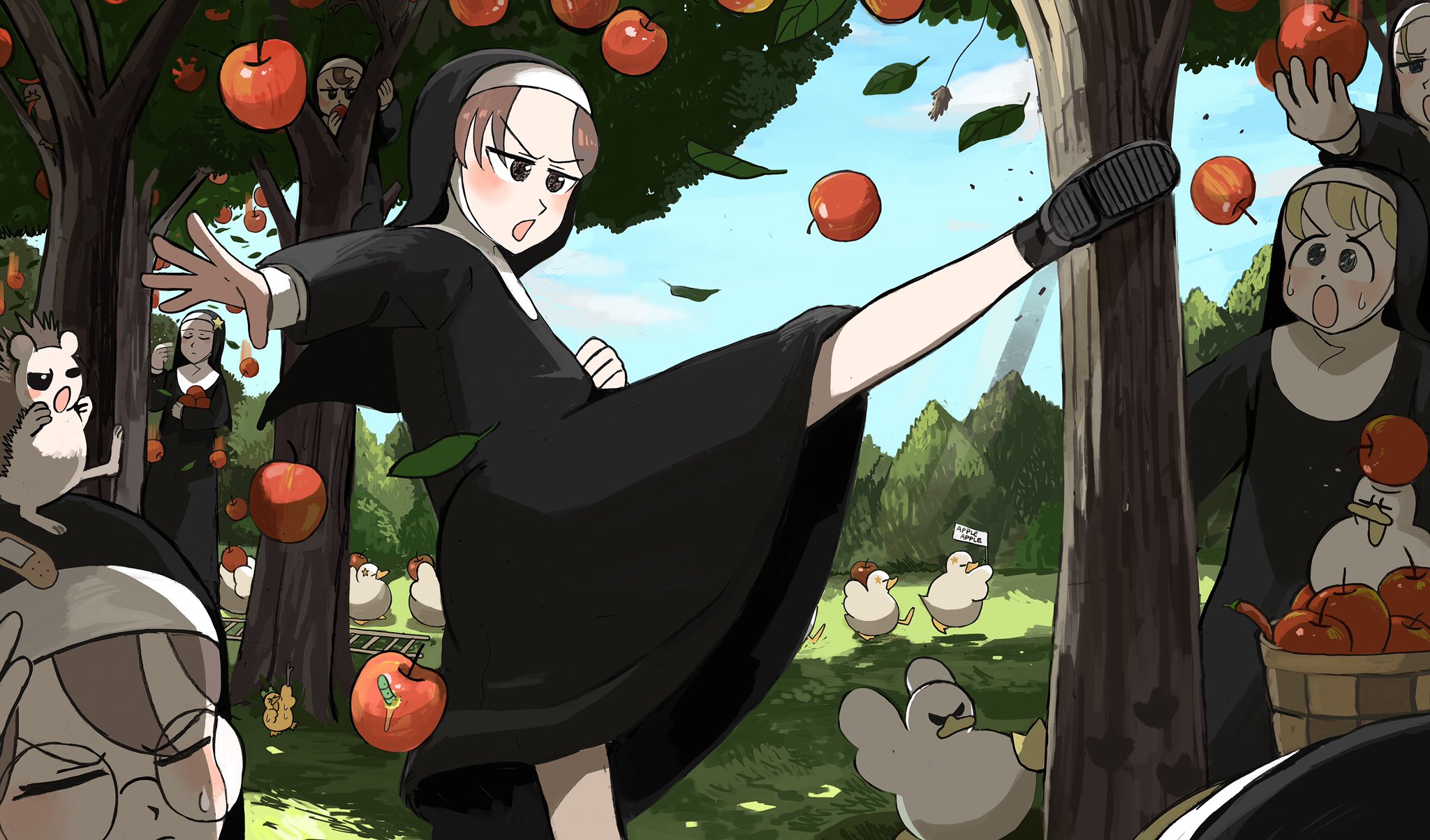 6+girls :o animal animal_on_head apple baby_animal basket beak_hold bird catching chicken chili_pepper clumsy_nun_(diva) diva_(hyxpk) duck duckling eating falling food footprints frog_headband froggy_nun_(diva) fruit glasses glasses_nun_(diva) hedgehog highres hungry_nun_(diva) in_tree kicking knocking ladder leaf little_nuns_(diva) marching motion_blur mouth_hold multiple_girls nun on_head outdoors shade slice_of_life spicy_nun_(diva) star_nun_(diva) strict_nun_(diva) traditional_nun tree twig worm