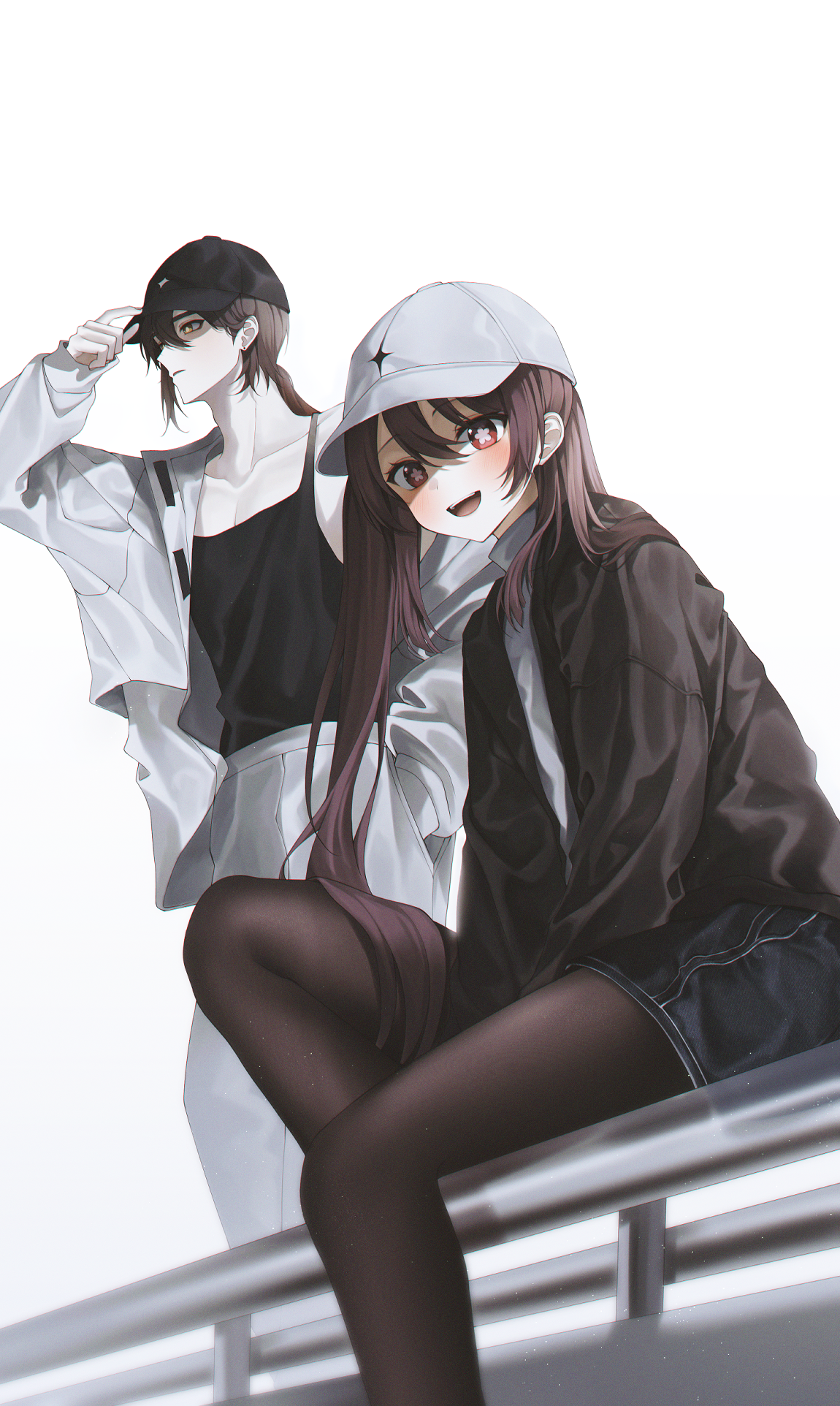 1boy 1girl :d black_pantyhose blush brown_hair genshin_impact hat highres hu_tao_(genshin_impact) jacket long_hair looking_at_viewer open_mouth pantyhose ponytail red_eyes shorts side_ponytail sitting smile solcha symbol-shaped_pupils yellow_eyes zhongli_(genshin_impact)
