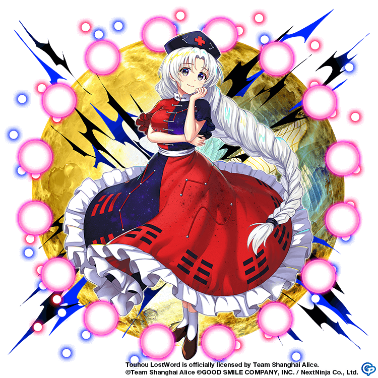 1girl arm_under_breasts blue_dress blue_eyes blue_hat braid breasts brown_shoes closed_mouth constellation_print copyright_notice cross danmaku dress frilled_dress frills full_body grey_hair happy hat long_hair medium_breasts moon nurse_cap official_art parted_bangs puffy_short_sleeves puffy_sleeves red_cross red_dress rotte_(1109) shoes short_sleeves single_braid smile socks solo standing touhou touhou_lostword transparent_background trigram two-tone_dress very_long_hair white_hair yagokoro_eirin