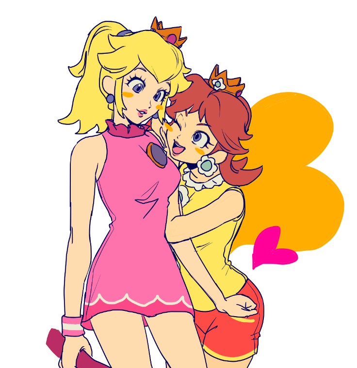 2girls adapted_costume arm_hug arms_at_sides bare_arms bare_legs bare_shoulders blonde_hair blue_eyes blush_stickers breasts brown_hair clenched_hand couple crown dress earrings eye_contact flower_earrings grin head_back head_down heart holding holding_racket jewelry long_hair looking_at_another looking_down looking_up mario_(series) mario_tennis mario_tennis_aces medium_breasts multiple_girls naughty_face nintendo one_eye_closed open_mouth parted_lips pink_dress ponytail princess_daisy princess_peach racket red_shorts shirt short_dress short_shorts shorts simple_background skirt sleeveless sleeveless_dress sleeveless_shirt smile standing white_background wink wristband yellow_shirt yondadida yuri