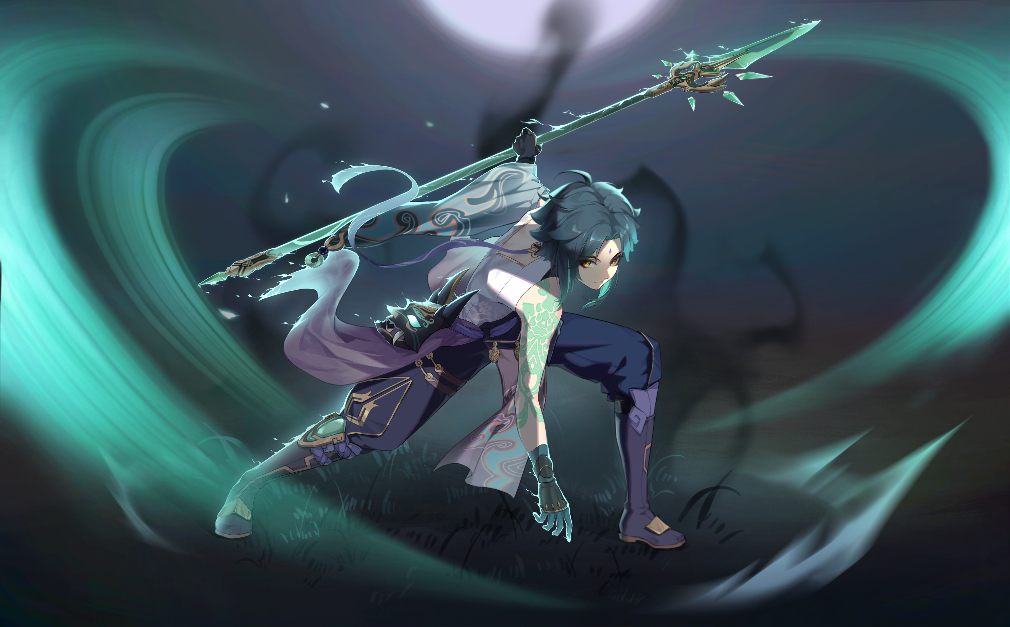 1boy absurdres bare_shoulders black_gloves black_pants boots chinese_clothes closed_mouth full_body genshin_impact gloves green_eyes highres holding holding_polearm holding_weapon knee_boots long_hair looking_at_viewer pants polearm purple_boots solo spear tattoo vuvkhkgi weapon xiao_(genshin_impact) yellow_eyes
