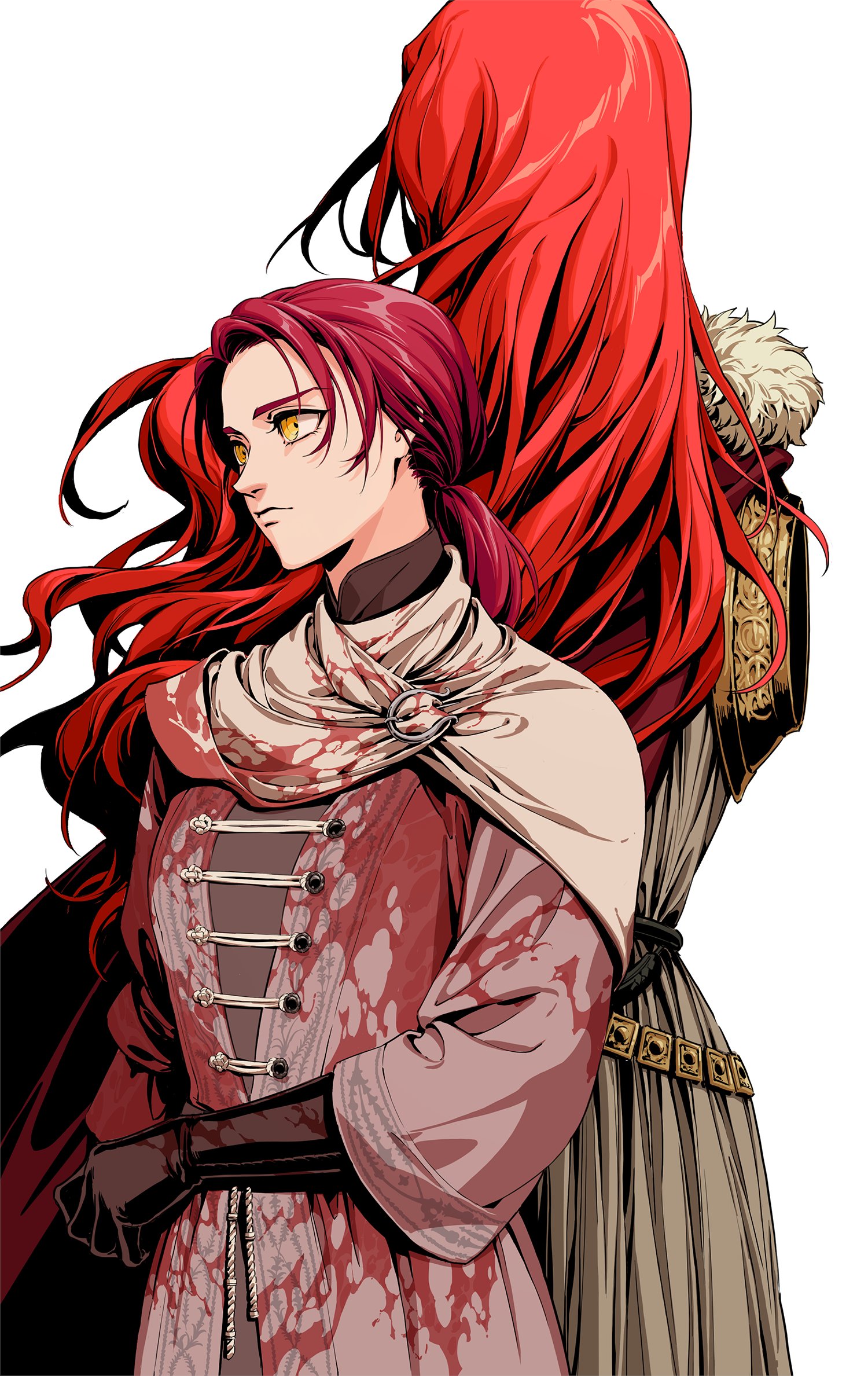 2girls blood cape closed_mouth dress elden_ring family highres holding holding_weapon long_hair malenia_blade_of_miquella mechanical_arms millicent_(elden_ring) mizuya mother_and_child mother_and_daughter multiple_girls parent_and_child prosthesis prosthetic_arm red_cape red_hair simple_background single_mechanical_arm very_long_hair weapon
