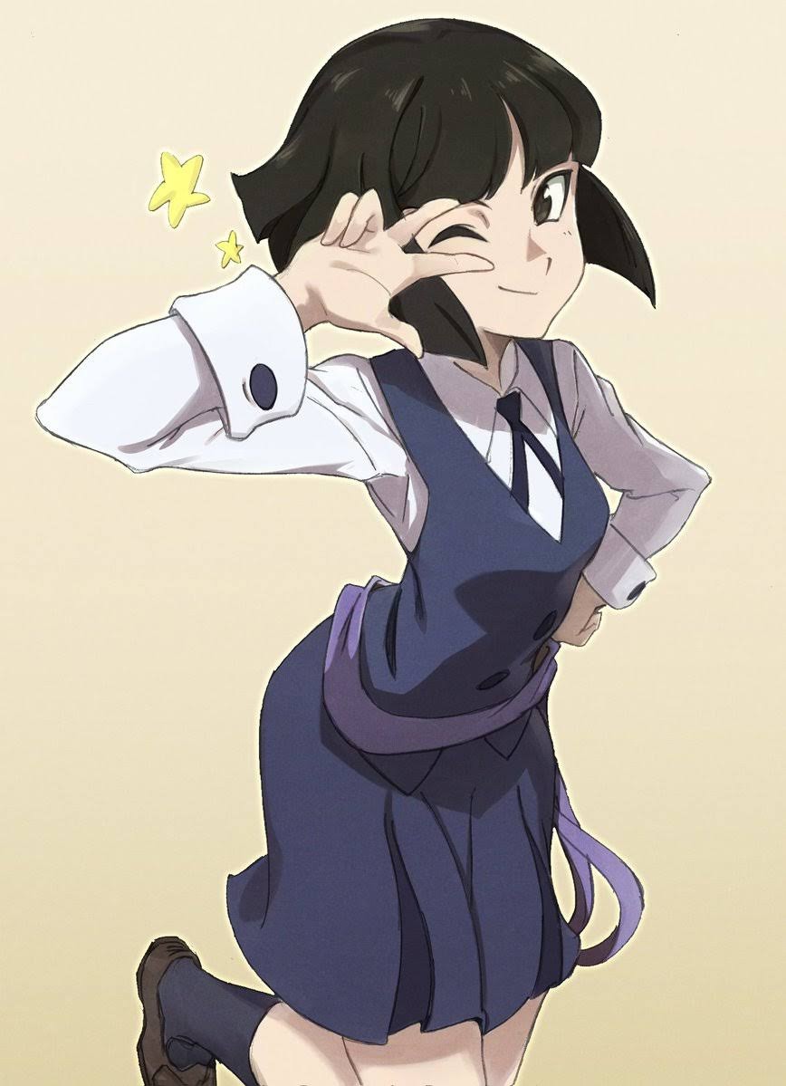 1girl ;) artist_request breasts little_witch_academia looking_at_viewer one_eye_closed school_uniform shao-yi skirt small_breasts smile solo standing standing_on_one_leg tagme v wink