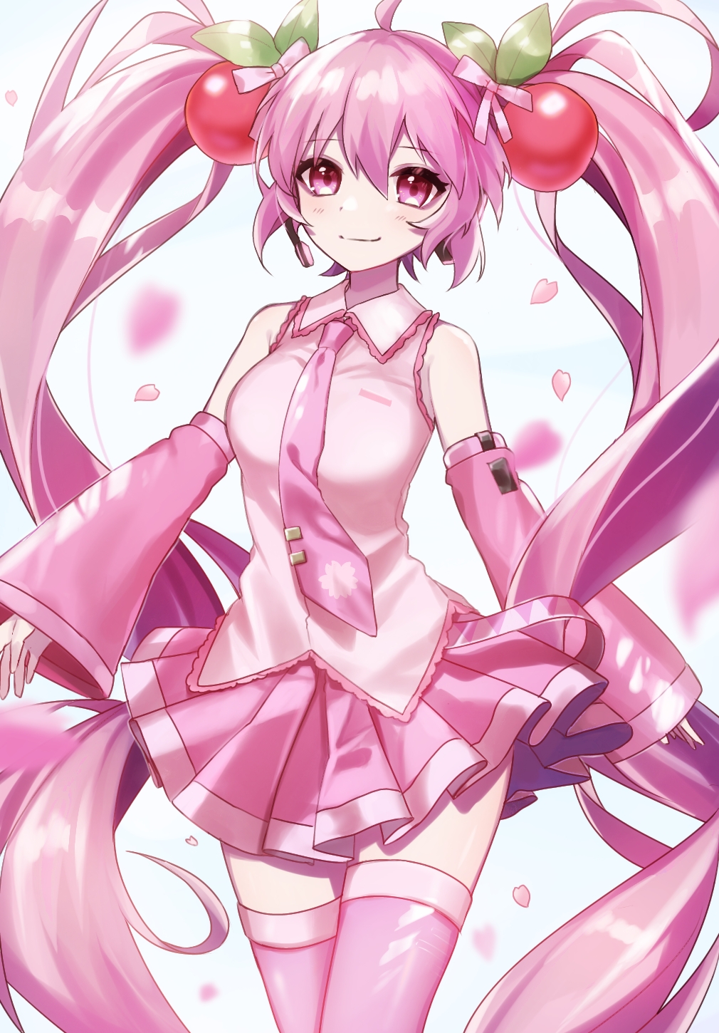 1girl absurdly_long_hair ahoge blurry blurry_foreground cherry_blossoms closed_mouth collared_shirt detached_sleeves dress_shirt floating_hair hair_between_eyes hair_ornament hair_ribbon hatsune_miku headphones headset highres long_hair long_sleeves microphone miniskirt necktie pink_hair pink_necktie pink_ribbon pink_shirt pink_skirt pink_sleeves pink_thighhighs pleated_skirt red_eyes ribbon sakura_miku shirt skirt sleeveless sleeveless_shirt smile solo soramame_pikuto thighhighs twintails very_long_hair vocaloid wing_collar zettai_ryouiki