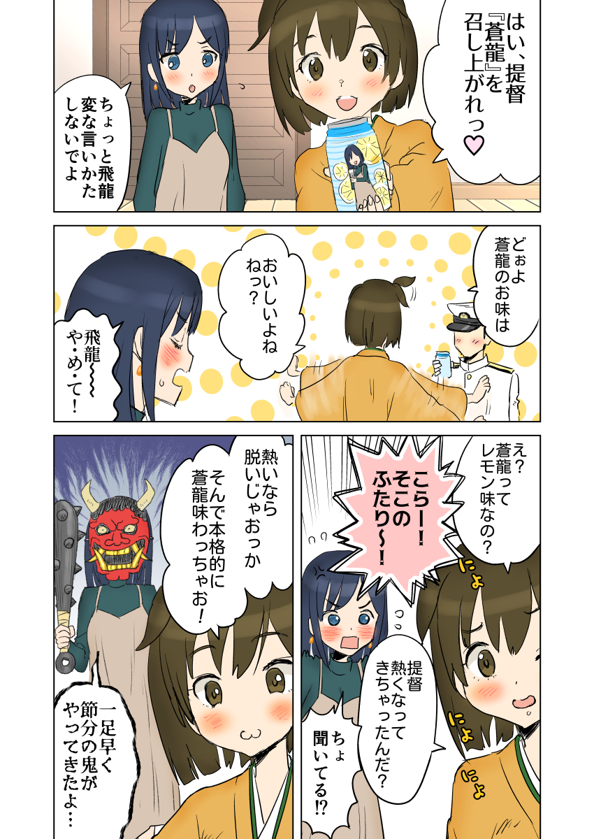 1boy 2girls admiral_(kancolle) afterimage beer_can black_hair blue_eyes brown_dress brown_hair can club club_(weapon) comic dress drink_can green_sweater highres hiryuu_(kancolle) hiryuu_(mitsukoshi_2019)_(kancolle) hiryuu_kai_ni_(kancolle) japanese_clothes kanabou kantai_collection kimono kujira_naoto long_hair mask meta multiple_girls official_alternate_costume one_side_up oni_mask orange_kimono short_hair souryuu_(kancolle) souryuu_(lawson)_(kancolle) spiked_club sweater translation_request turtleneck weapon