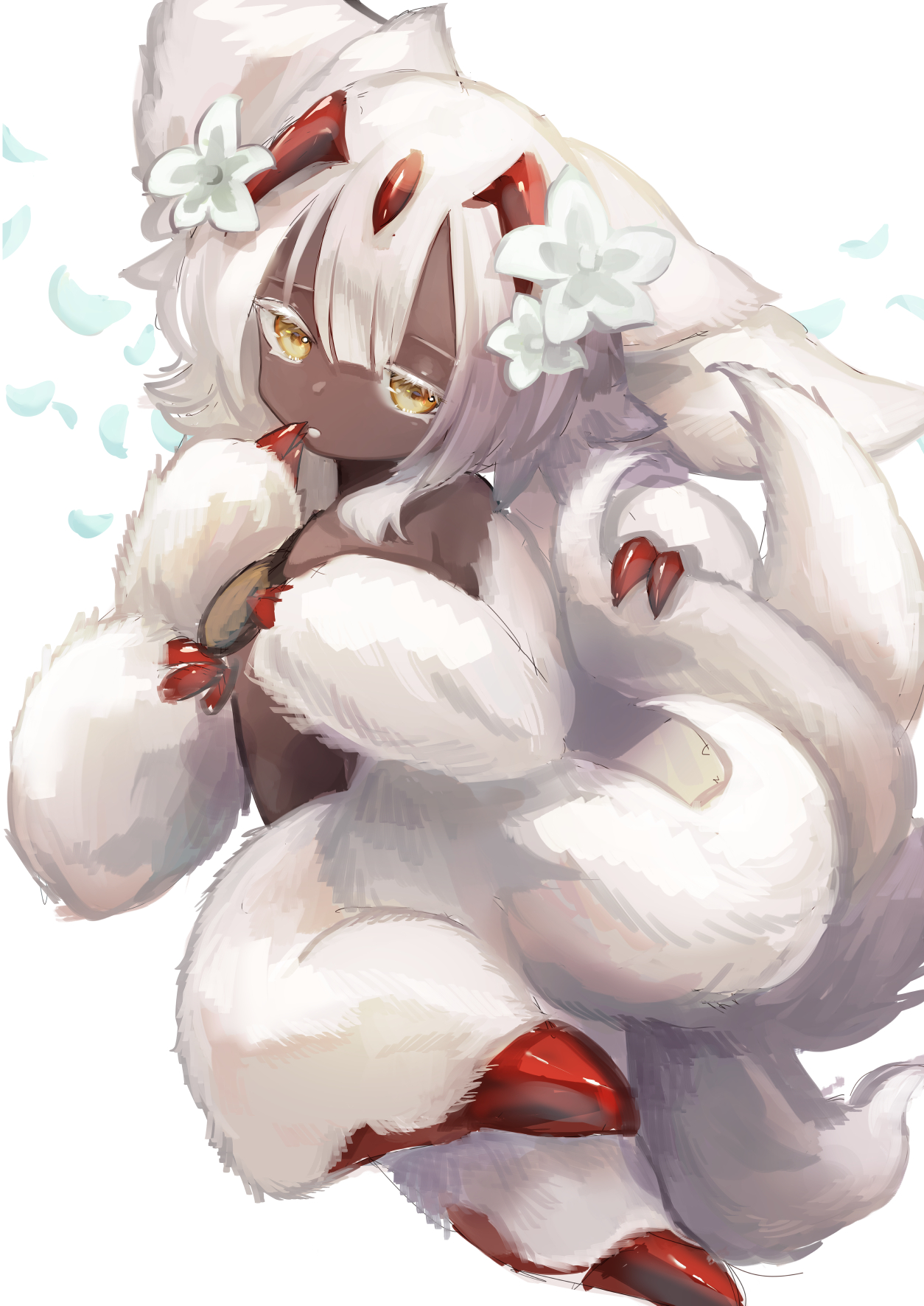 1girl animal_ears blunt_bangs body_fur claws colored_eyelashes commentary dark-skinned_female dark_skin extra_arms falling_petals faputa fewer_digits finger_to_mouth flower fluffy from_side full_body hair_flower hair_ornament half-closed_eyes hand_up hemorina highres horns leg_up looking_at_viewer made_in_abyss monster_girl multiple_horns multiple_tails petals red_horns short_hair simple_background solo tail white_background white_flower white_fur white_hair yellow_eyes