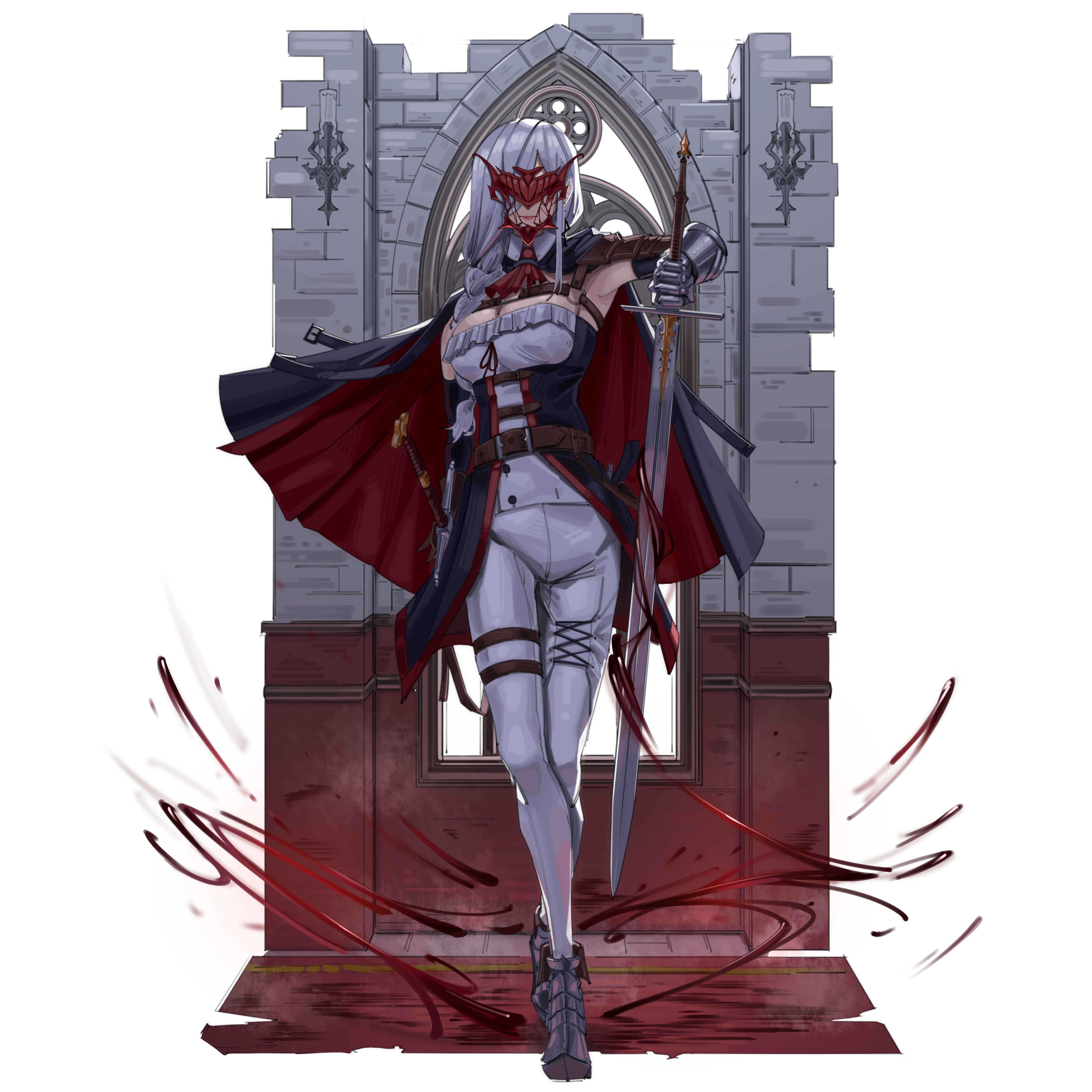 1girl absurdres ascot belt breasts cape gauntlets grey_hair hair_over_one_eye harris_hero highres holding holding_sword holding_weapon knight large_breasts armored_boots original pants red_ascot red_mask sword weapon white_pants window yuri_crimson
