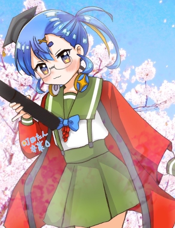 1girl blue_hair cherry_blossoms graduation green_skirt machida-tan skirt suspenders