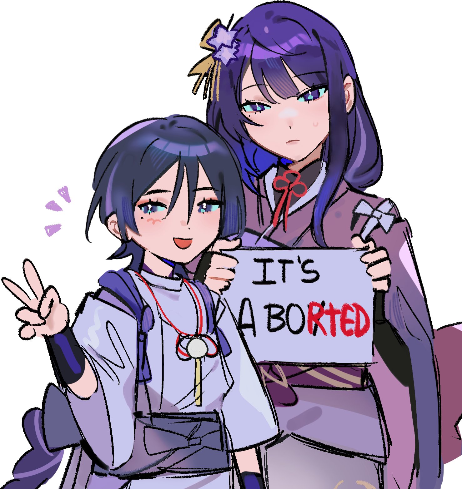 1boy 1girl english_text frown genshin_impact hair_ornament highres holding holding_sign knot long_hair looking_at_viewer mechodes mother_and_child mother_and_son open_mouth parent_and_child purple_eyes purple_hair raiden_shogun scaramouche_(genshin_impact) scaramouche_(kabukimono)_(genshin_impact) short_hair sign smile v very_long_hair white_background wrist_cuffs