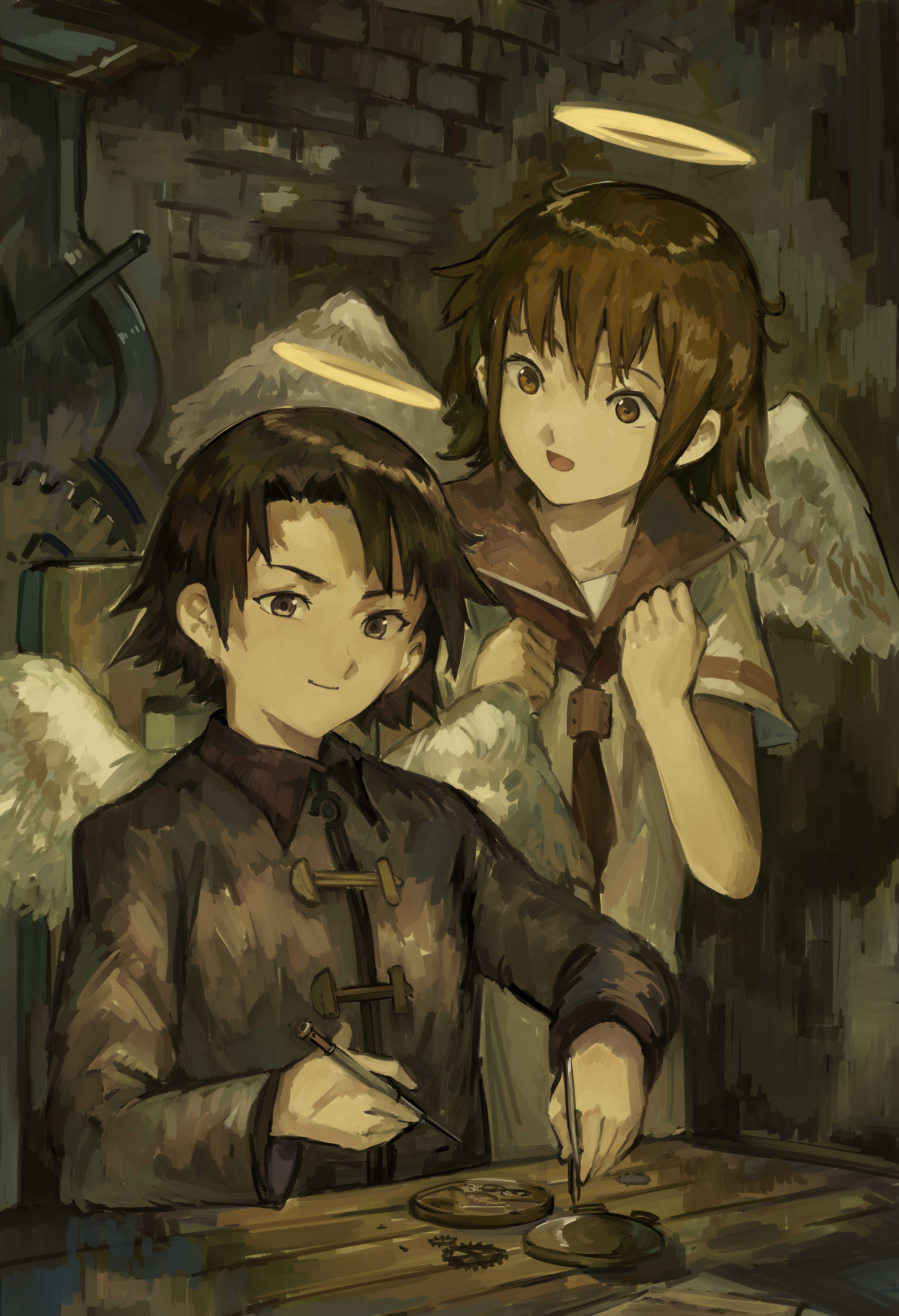 2girls absurdres androgynous angel angel_wings black_hair brick_wall brown_eyes brown_hair chair chinese_clothes dress feathers gears haibane_renmei halo hands_up highres holding holding_screwdriver indoors kana_(haibane_renmei) kornod long_sleeves multiple_girls neckerchief pocket_watch rakka_(haibane_renmei) red_neckerchief red_sailor_collar reverse_trap sailor_collar sailor_dress screwdriver short_hair sitting smile table tangzhuang toggles traditional_halo unkempt watch white_dress white_wings wings