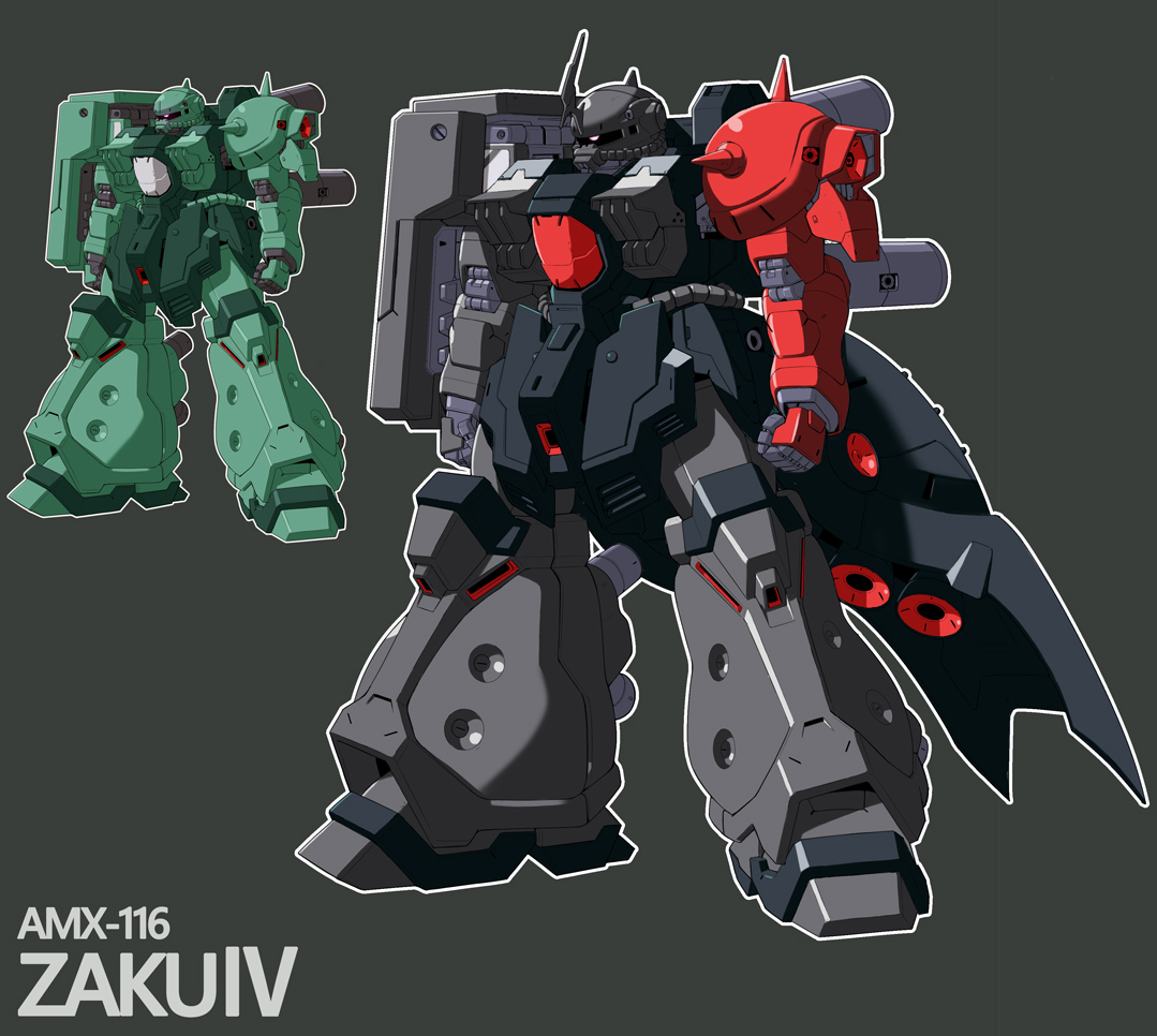 asaba_naoto character_name clenched_hands grey_background gundam horns mecha mobile_suit moon_gundam no_humans one-eyed pink_eyes robot science_fiction single_horn variations zaku zaku_iv