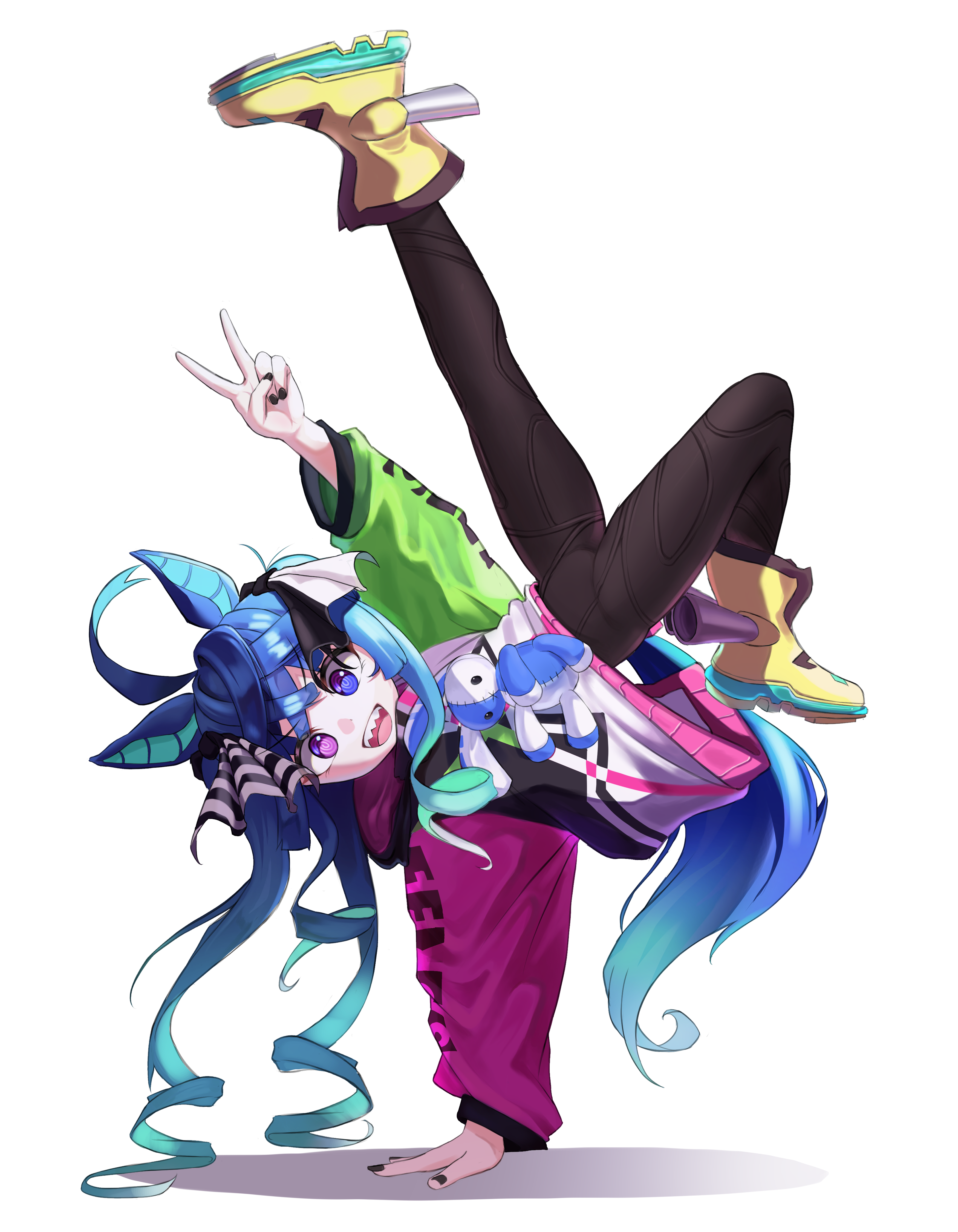 1girl absurdres ahoge animal_ears ankle_boots aqua_hair black_bodysuit black_nails black_ribbon blue_eyes blue_hair bodysuit boots breakdance coat commentary_request gradient_hair hair_ribbon handstand heterochromia highres horse_ears horse_girl horse_tail korean_commentary leg_up long_hair long_sleeves looking_at_viewer multicolored_coat multicolored_hair nail_polish one_arm_handstand open_mouth purple_eyes ribbon sangwook_kim shadow sharp_teeth simple_background smile solo stuffed_animal stuffed_rabbit stuffed_toy tail teeth twin_turbo_(blast_mode!_turbo_engine)_(umamusume) twin_turbo_(umamusume) twintails umamusume v very_long_hair white_background yellow_boots
