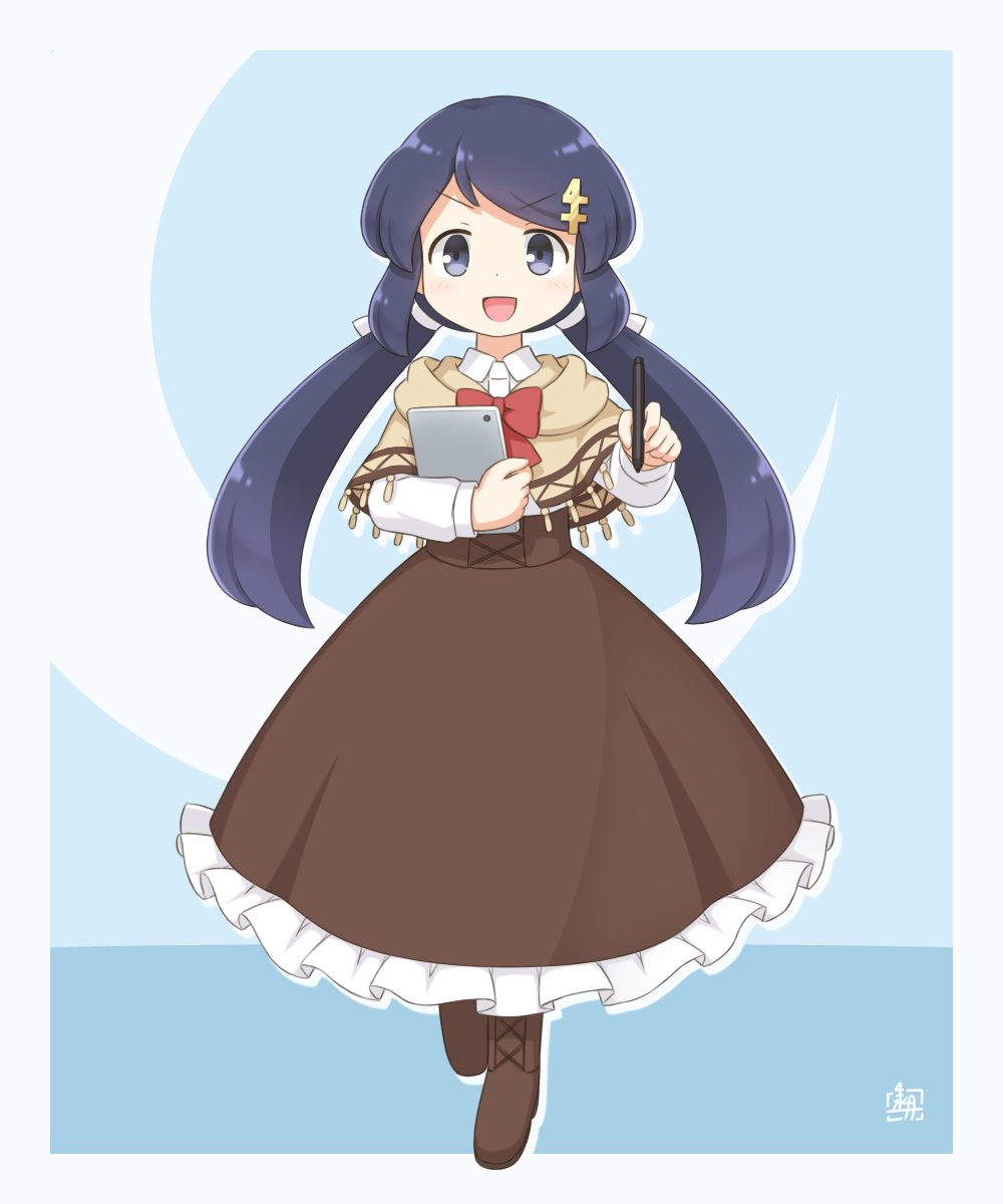 1girl :d black_hair blue_background boots bow brown_boots brown_capelet brown_skirt capelet collared_shirt commentary_request drawing_tablet dress_shirt frilled_skirt frills fringe_trim full_body hair_ornament high-waist_skirt highres holding holding_stylus kitagawa_suigetsu lace-up_boots long_hair low_twintails open_mouth original outline red_bow shirt skirt smile solo standing stylus swept_bangs twintails v-shaped_eyebrows very_long_hair white_outline white_shirt