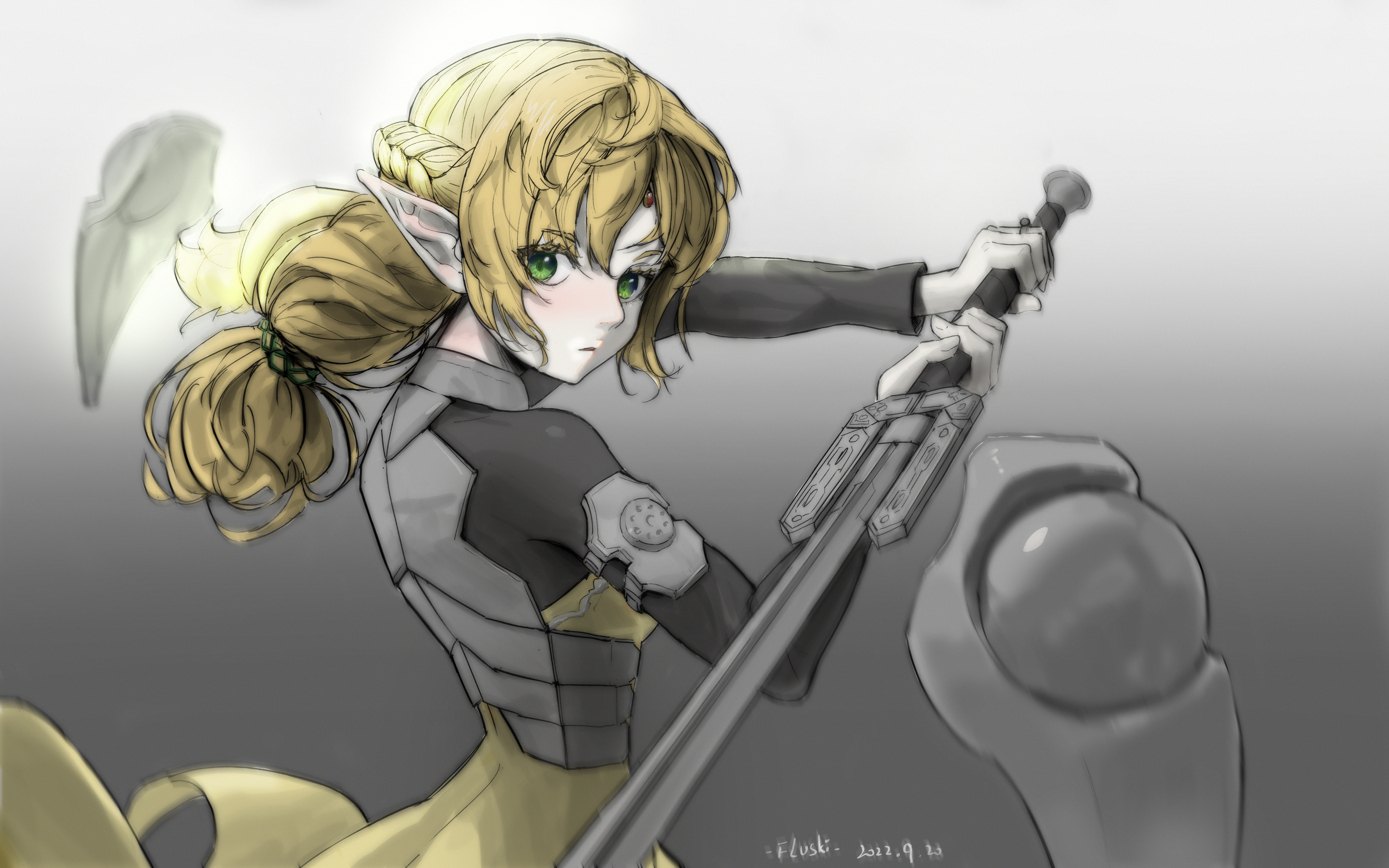 1girl absurdres armor blonde_hair braid dated dress elf flvski gradient_background grey_background highres holding holding_weapon isekai_ojisan long_hair long_sleeves looking_at_viewer parted_lips pointy_ears ponytail signature solo sui_(isekai_ojisan) sword upper_body weapon yellow_dress