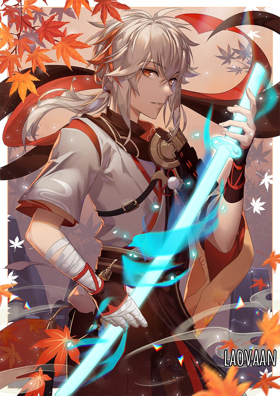 1boy armor artist_name autumn_leaves bandaged_arm bandaged_hand bandages belt border cowboy_shot crossed_bangs falling_leaves genshin_impact hair_between_eyes highres holding holding_sword holding_weapon japanese_armor japanese_clothes kaedehara_kazuha katana laovaan leaf long_hair looking_at_viewer low_ponytail male_focus multicolored_hair parted_lips ponytail red_eyes red_hair short_sleeves solo streaked_hair sword weapon white_hair