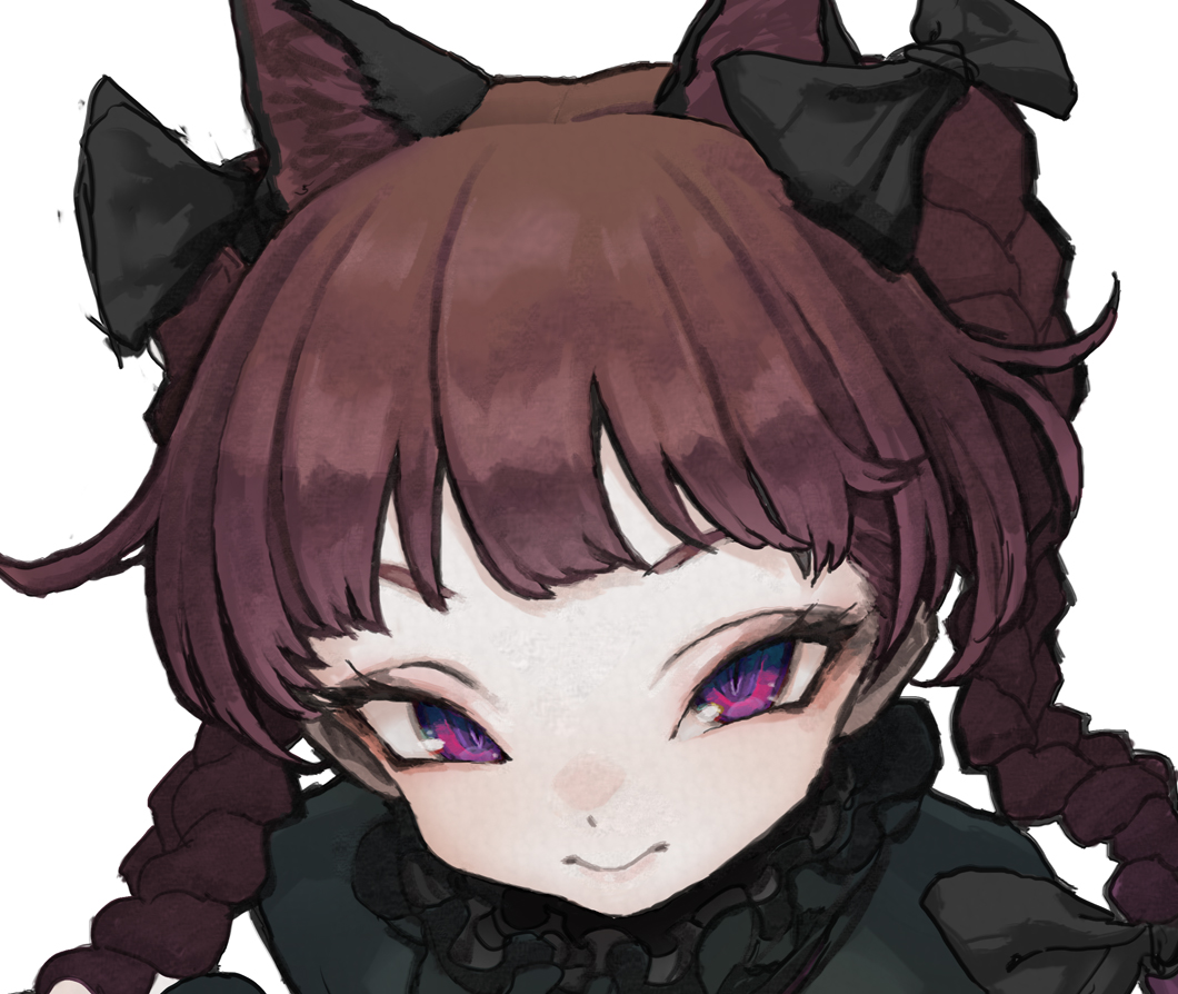 1girl animal_ears ashitano_kirin black_bow blunt_bangs bow braid cat_ears dress eyebrows_hidden_by_hair frills from_above green_dress hair_bow kaenbyou_rin looking_at_viewer portrait red_hair simple_background smile solo touhou tsurime twin_braids white_background