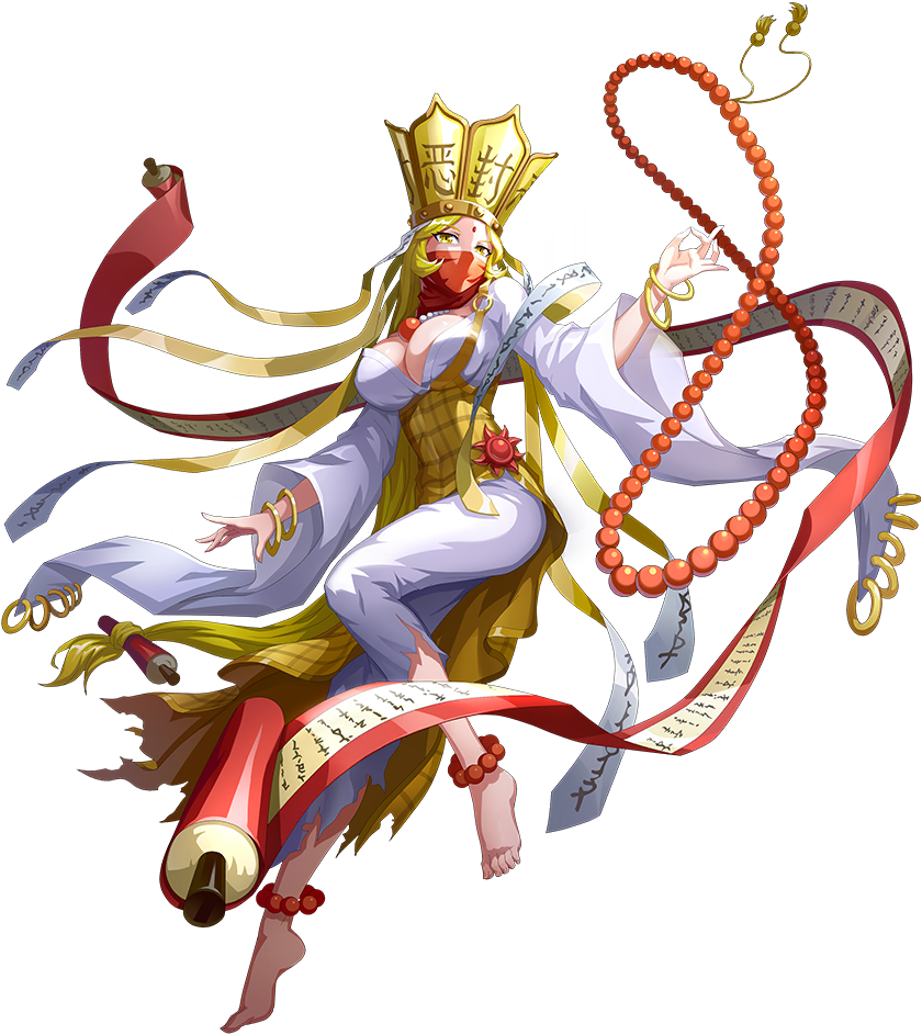 1girl bandai barefoot blonde_hair breasts crown digimon digimon_new_century dress large_breasts long_hair looking_at_viewer mask monk official_art sanzomon scroll shiny_skin solo toes wide_hips yellow_eyes
