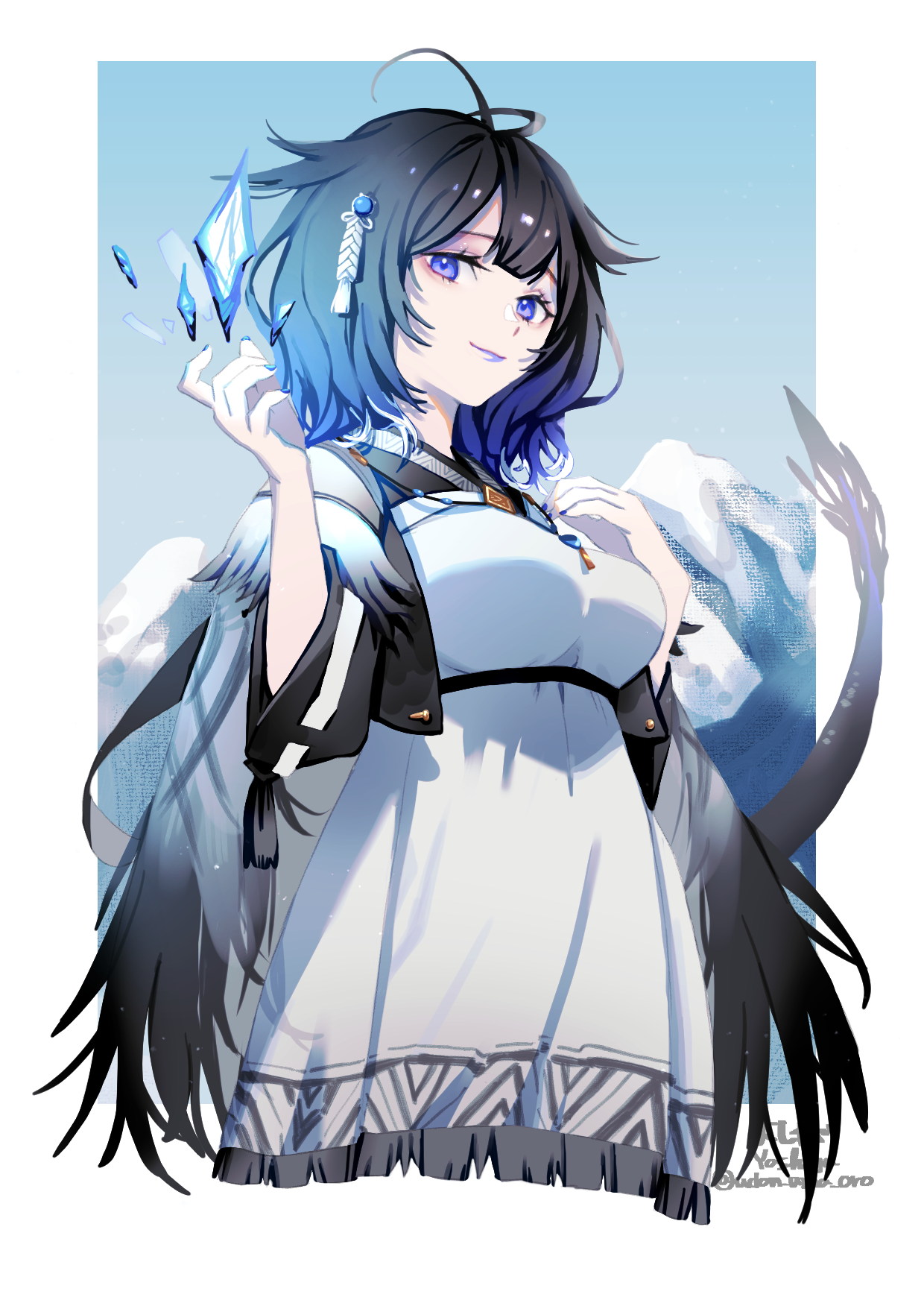 1girl antennae arknights artist_name black_hair blue_eyes blue_hair border breasts crystal dress gradient_hair hair_flaps hand_up highres kjera_(arknights) large_breasts looking_at_viewer mountain multicolored_hair outside_border short_hair smile solo tail twitter_username upper_body white_border white_dress yoshiga