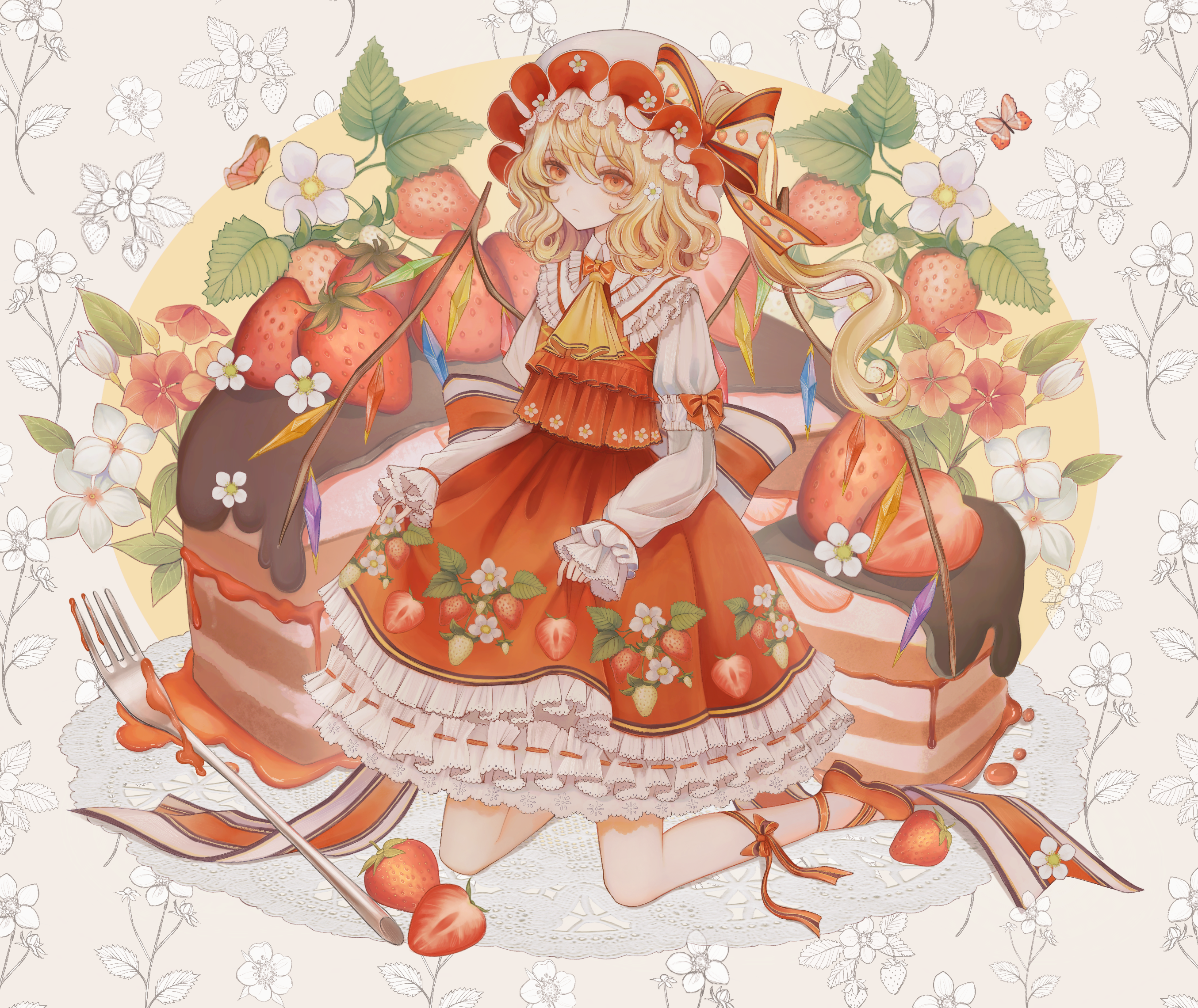 1girl animal ascot blonde_hair bug butterfly cake closed_mouth collared_shirt crystal flandre_scarlet flower food fork fruit hair_between_eyes hat highres hourai_kiriri insect long_hair long_sleeves mob_cap red_eyes red_skirt red_vest shirt side_ponytail skirt solo strawberry touhou vest white_flower white_hat white_shirt wings yellow_ascot
