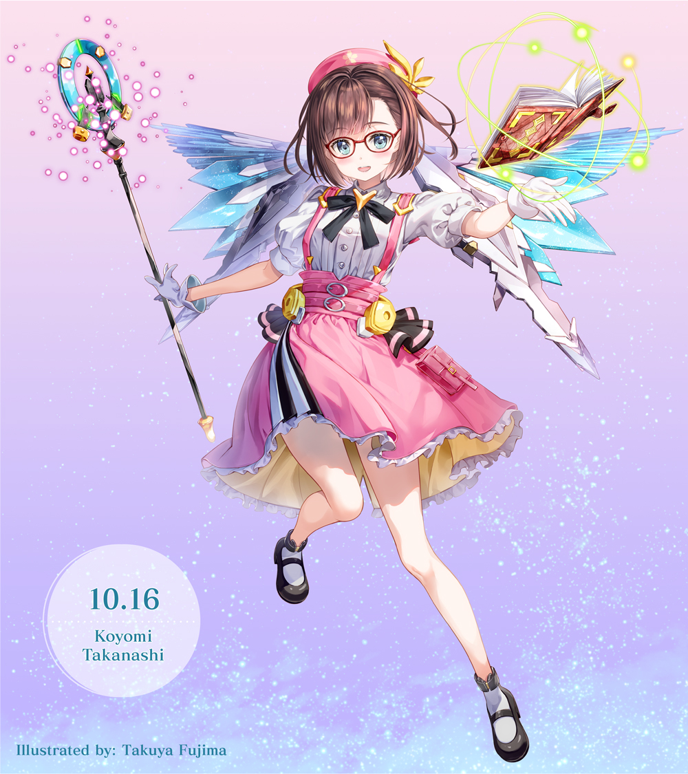 1girl artist_name beret birthday black_ribbon black_shoes blouse blue_eyes book brown_hair character_name fujima_takuya full_body gloves gradient_background hat holding holding_staff legs looking_at_viewer magical_girl mary_janes neck_ribbon pink_hat pink_skirt red-framed_eyewear ribbon shirt shoes short_hair simple_background skirt socks solo sousai_shoujo_teien staff suspender_skirt suspenders takanashi_koyomi thighs white_background white_gloves white_shirt white_socks wings
