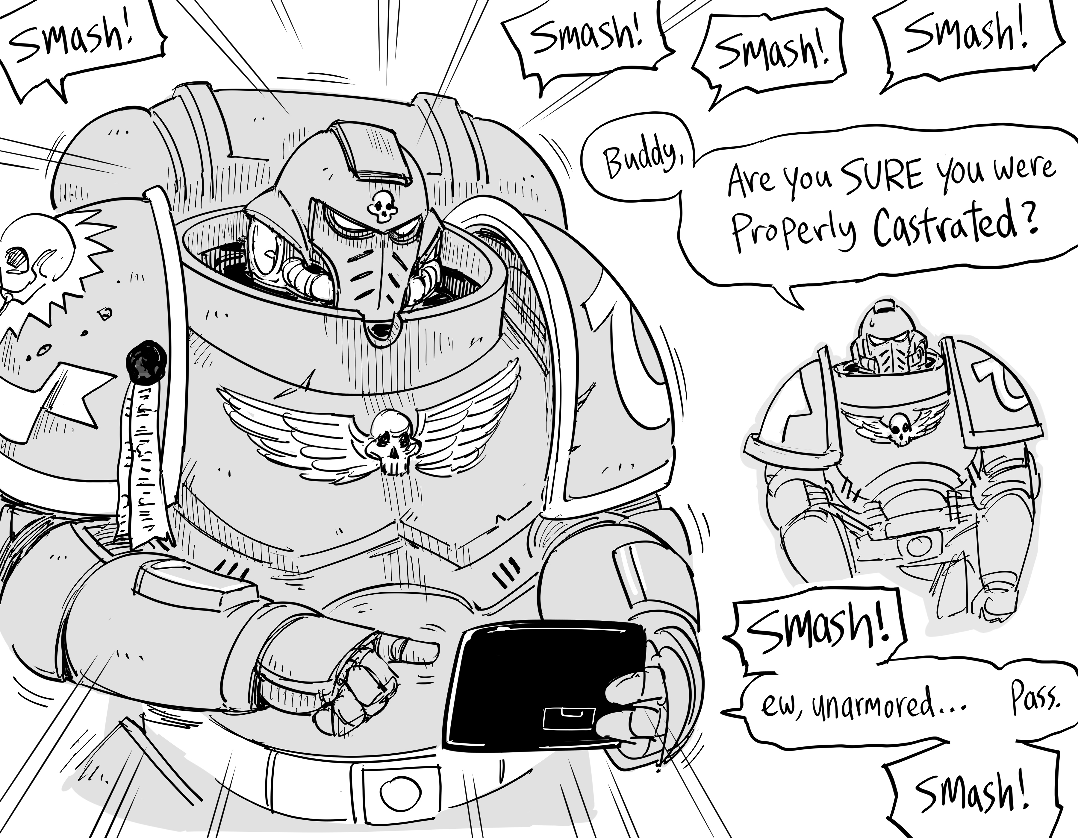 2boys absurdres adeptus_astartes armor bb_(baalbuddy) commentary english_commentary english_text greyscale helmet highres holding holding_tablet_pc imperium_of_man male_focus monochrome multiple_boys power_armor primaris_space_marine simple_background skull sweatdrop tablet_pc warhammer_40k white_background