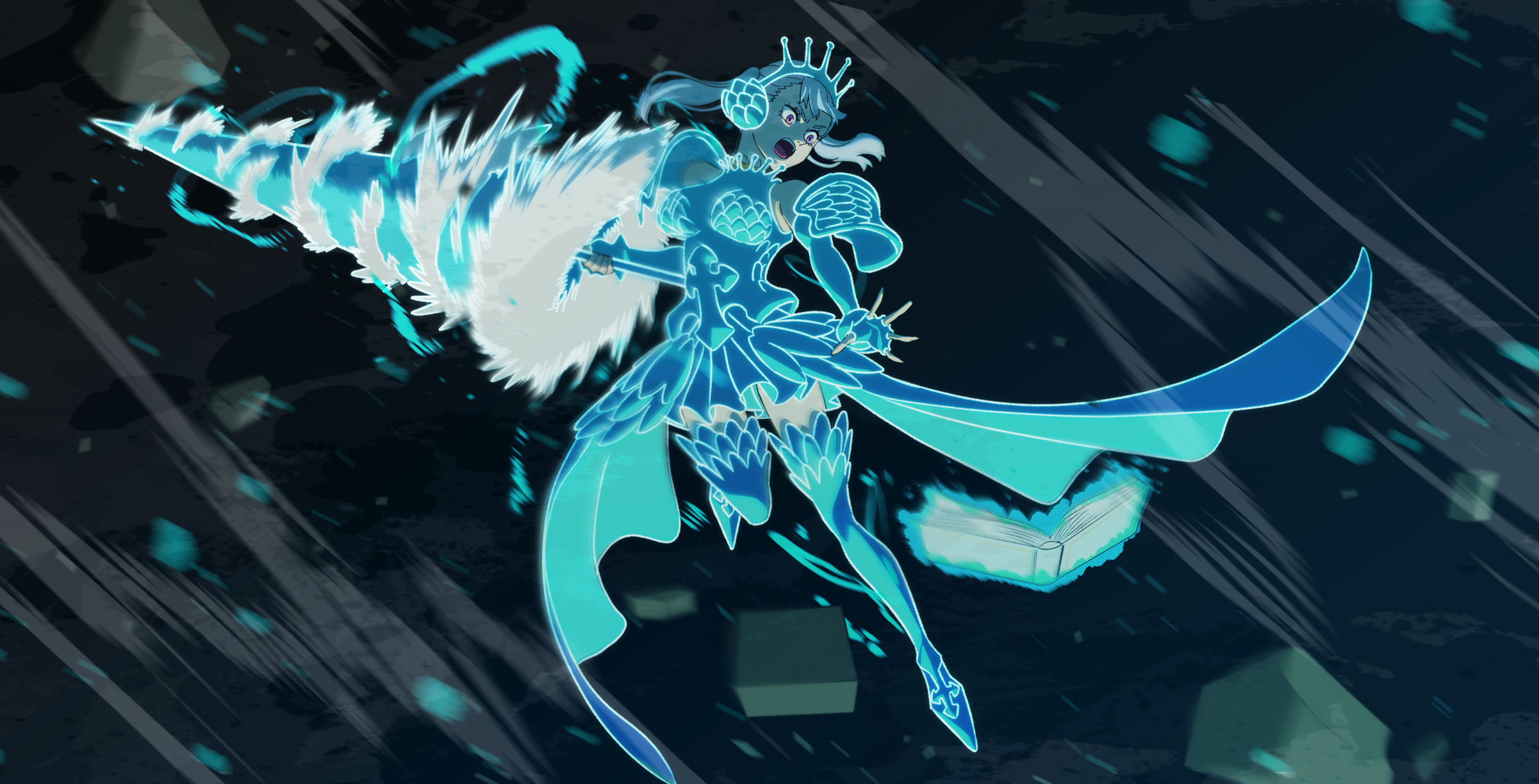 armor armored_dress black_clover blue_armor book dress grimoire highres holding holding_polearm holding_weapon noelle_silva pink_eyes polearm valkyrie water weapon yoshihara_tatsuya