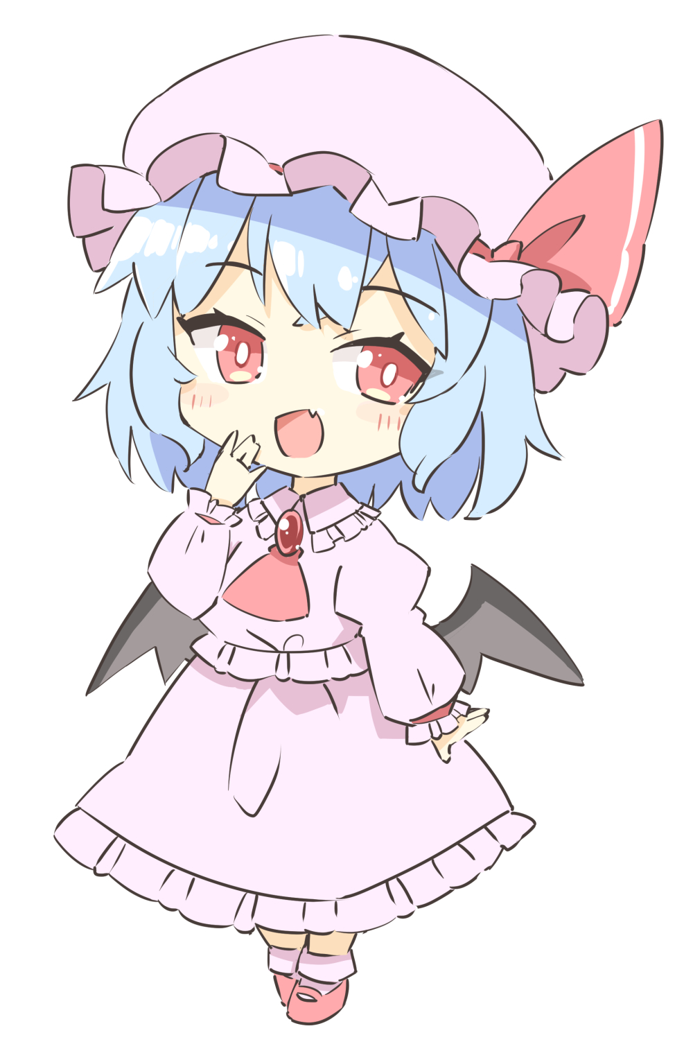 1girl :d arnest ascot bat_wings black_wings blue_hair bright_pupils fang full_body highres light_blue_hair looking_at_viewer open_mouth red_ascot red_eyes red_footwear remilia_scarlet shirt short_hair simple_background skin_fang skirt smile socks solo touhou white_background white_pupils white_shirt white_skirt white_socks wings