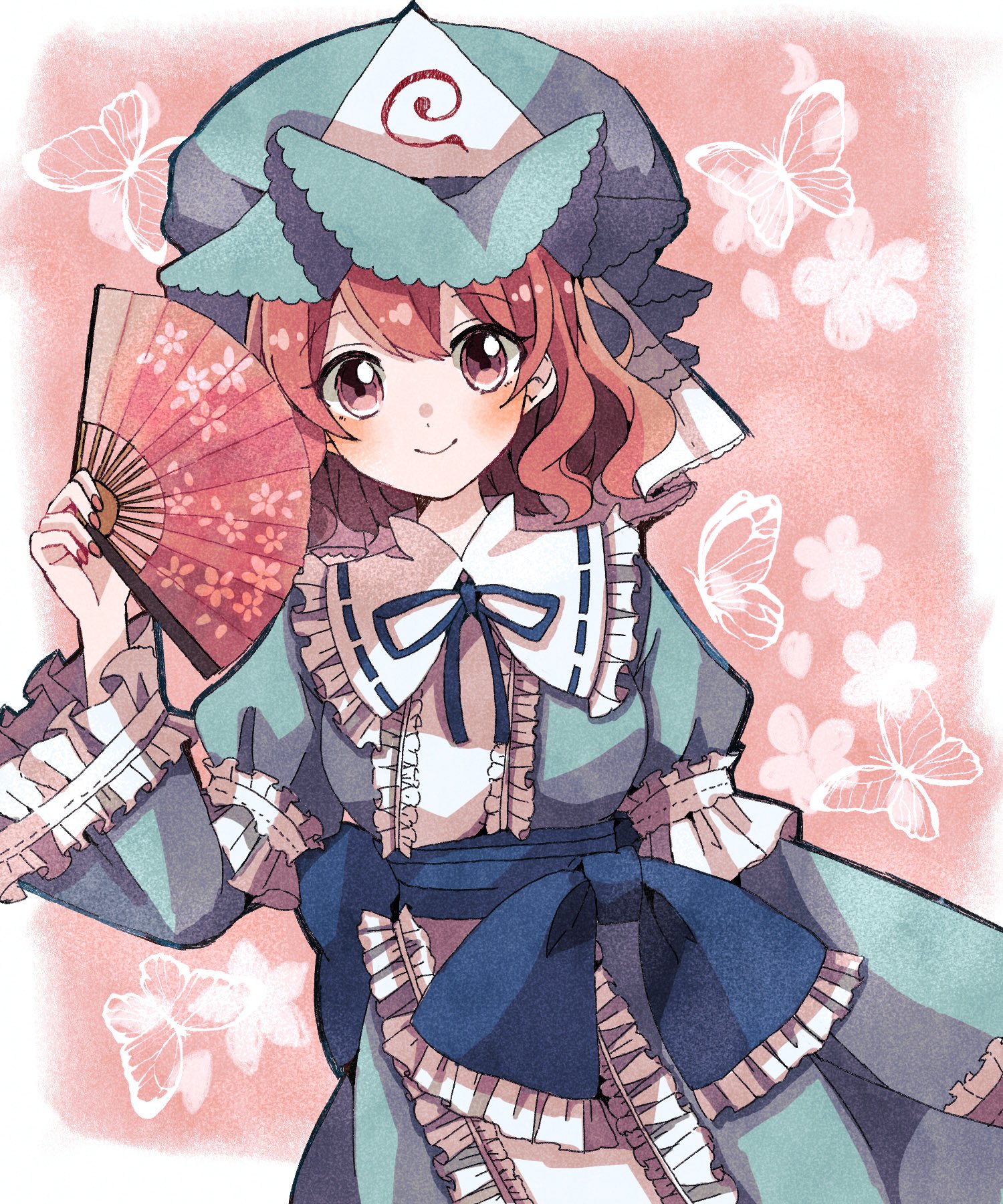 1girl black_footwear blue_hat blue_kimono blue_ribbon blue_sash commentary_request frilled_kimono frilled_sash frilled_sleeves frills hat highres japanese_clothes kimono long_sleeves mo_25_mo mob_cap neck_ribbon obi pink_eyes pink_hair ribbon saigyouji_yuyuko sash short_hair sleeve_garter solo touhou wavy_hair wide_sleeves