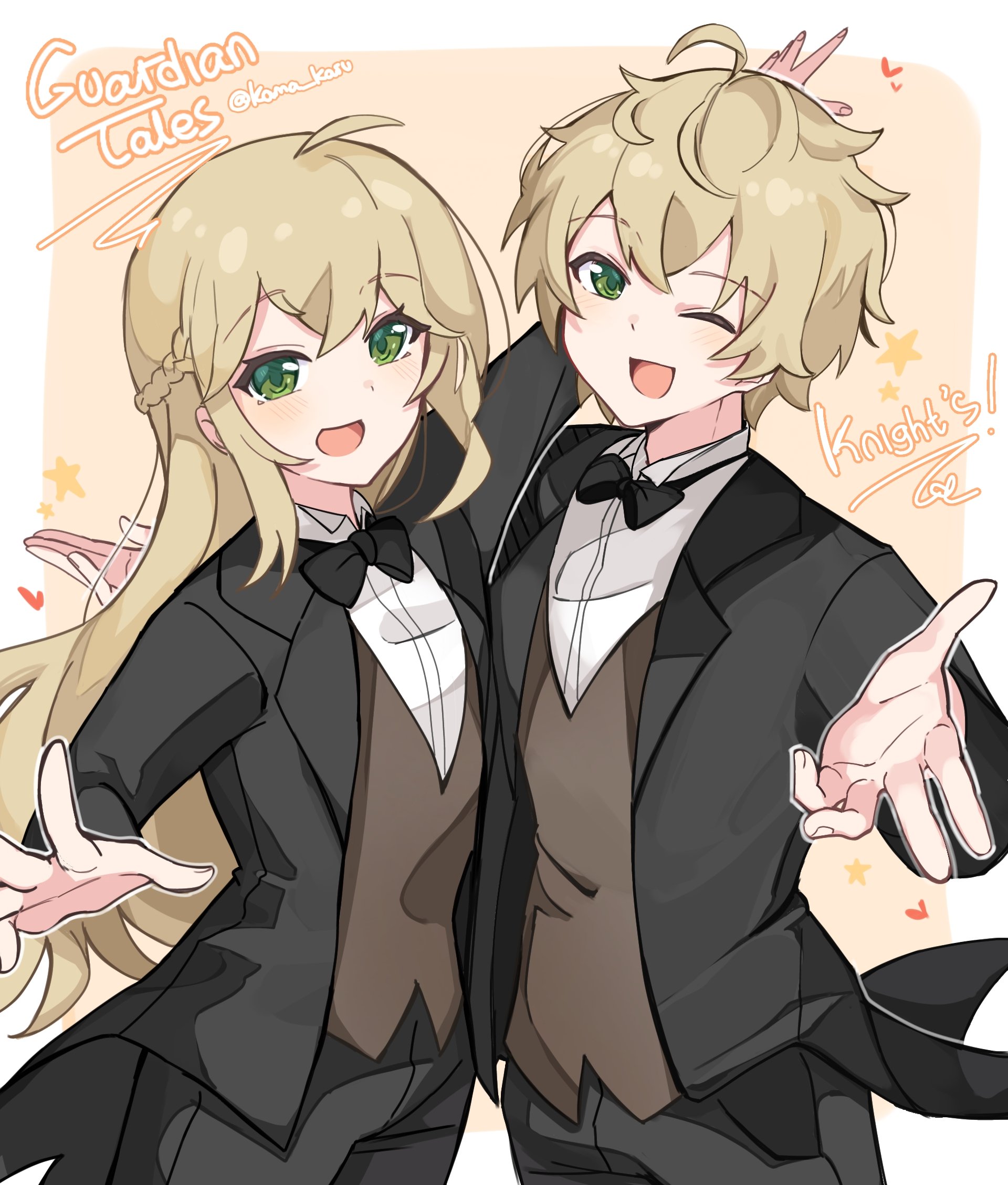 1boy 1girl arms_behind_back black_suit blonde_hair bow bowtie brown_vest curly_hair female_knight_(guardian_tales) formal_clothes green_eyes guardian_tales highres kama_karu male_knight_(guardian_tales) one_eye_closed open_mouth outstretched_arms pants simple_background suit vest