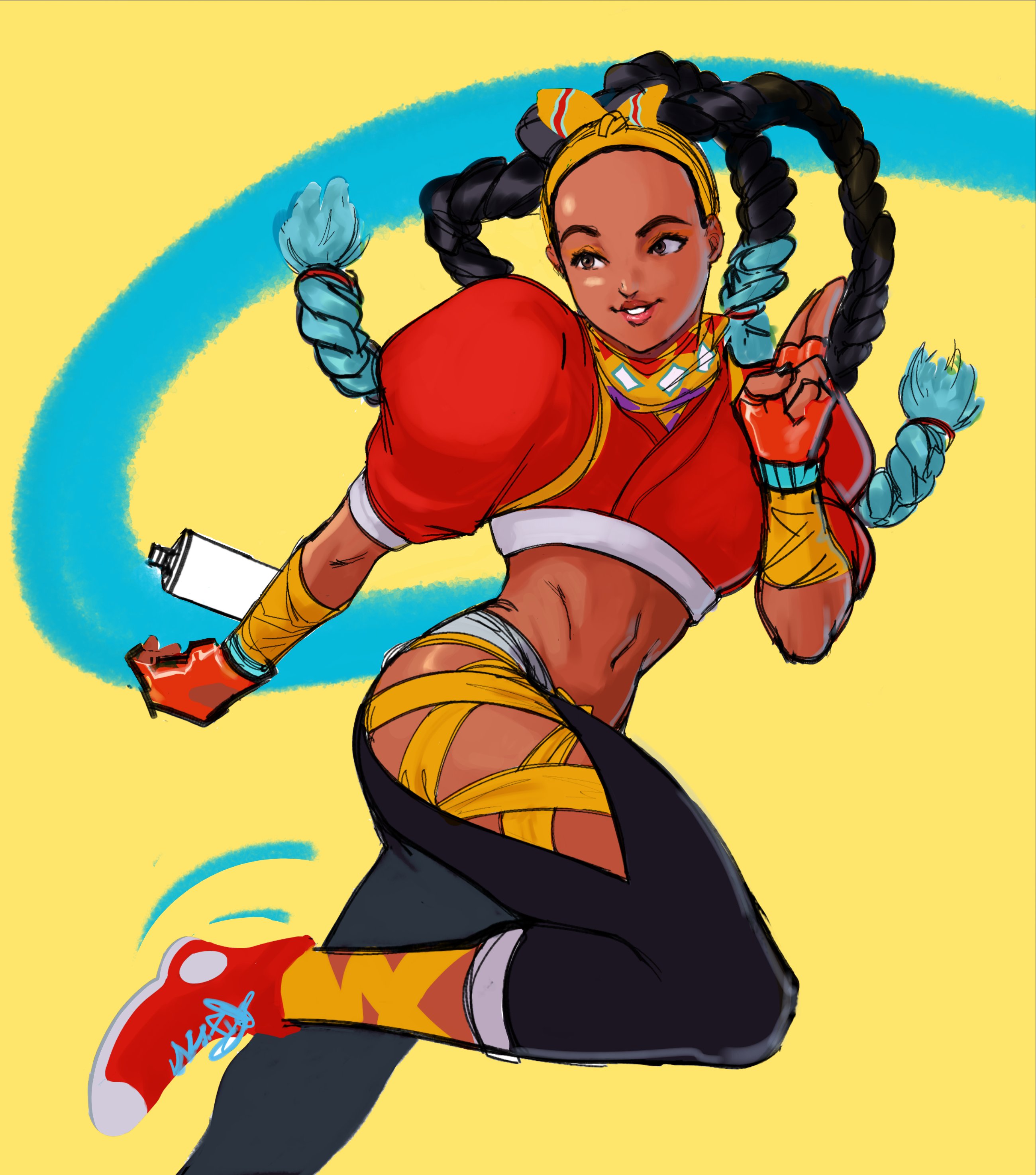 1girl absurdres aqua_hair arm_wrap bow_hairband brown_eyes brown_lips clothing_cutout colored_tips commentary converse cropped_jacket dark-skinned_female dark_skin english_commentary forehead gloves hairband highres hip_vent jacket jed_(jedzem) kimberly_jackson long_hair midriff multicolored_hair navel puffy_short_sleeves puffy_sleeves quad_braids red_gloves red_jacket running salute shoes short_sleeves smartwatch sneakers solo spray_can street_fighter street_fighter_6 thick_eyebrows toned toned_female two-finger_salute very_dark_skin watch wristwatch yellow_background yellow_hairband