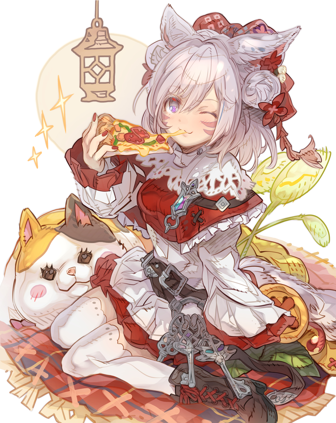 1girl ;) animal_ears blush boots brown_boots capelet cat_ears cheese cheese_trail commentary_request commission double_bun dress eating facial_mark final_fantasy final_fantasy_xiv food frilled_capelet frills full_body grey_hair hair_between_eyes hair_bun haku_(sabosoda) highres holding holding_food lace-up_boots long_sleeves looking_at_viewer miqo'te nail_polish one_eye_closed pizza pizza_slice purple_eyes red_capelet red_nails simple_background sitting skeb_commission sleeves_past_wrists smile solo sparkle thighhighs wariza warrior_of_light_(ff14) whisker_markings white_background white_dress white_thighhighs