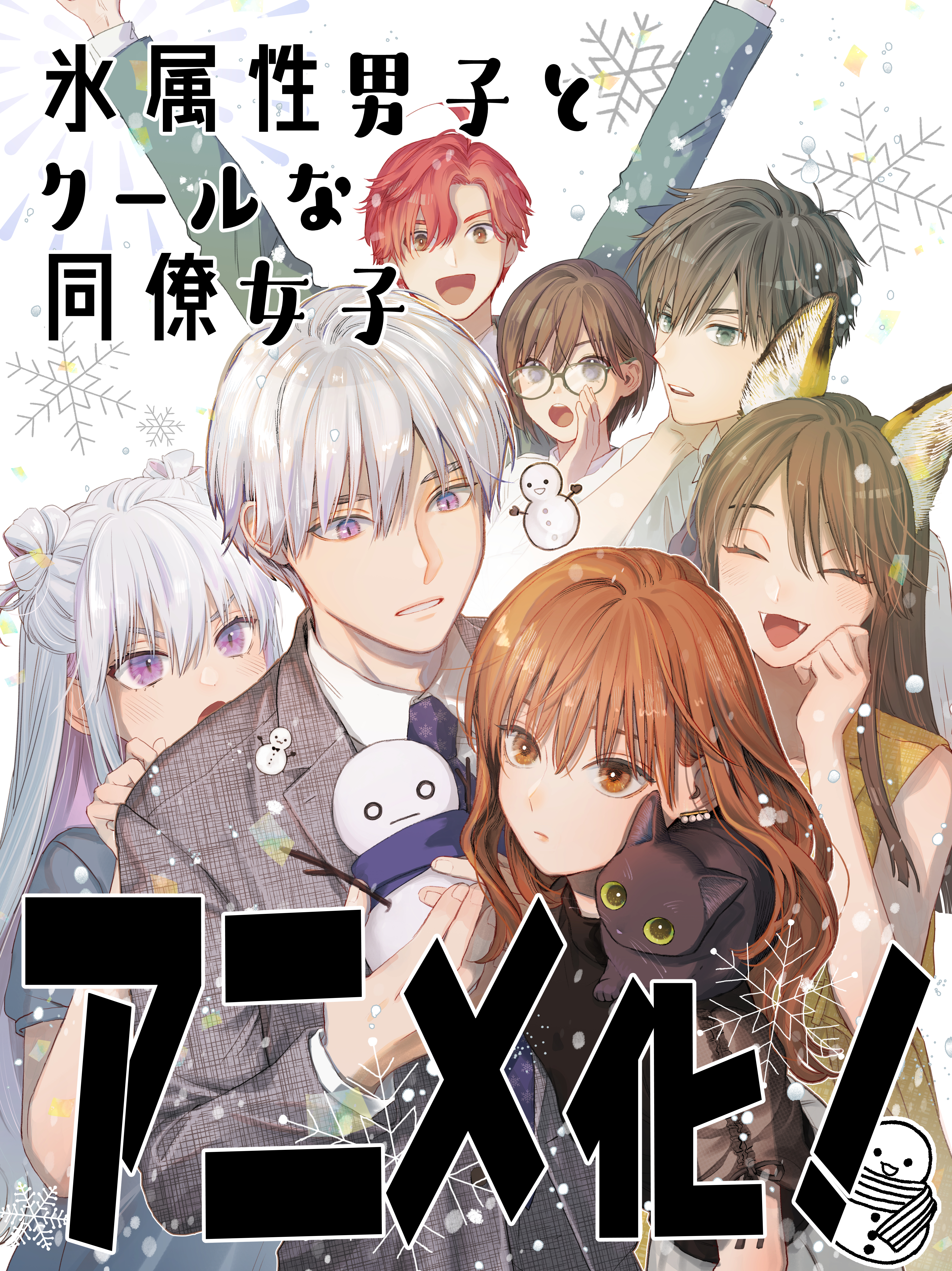 3boys 4girls absurdres animal_ears black_cat brown_eyes brown_hair cat closed_eyes eyebrows_hidden_by_hair fox_ears fox_girl fuyutsuki_mio glasses green_eyes hair_between_eyes highres himuro_yukiya katori_(koori_zokusei_danshi) komori_(koori_zokusei_danshi) koori_zokusei_danshi_to_cool_na_douryou_joshi long_hair looking_at_viewer multiple_boys multiple_girls nyamero_(koori_zokusei_danshi) open_mouth otonashi_(koori_zokusei_danshi) purple_eyes red_eyes red_hair saejima_(koori_zokusei_danshi) short_hair smile snowman teeth tonogaya twintails white_hair yukimin_(koori_zokusei_danshi)