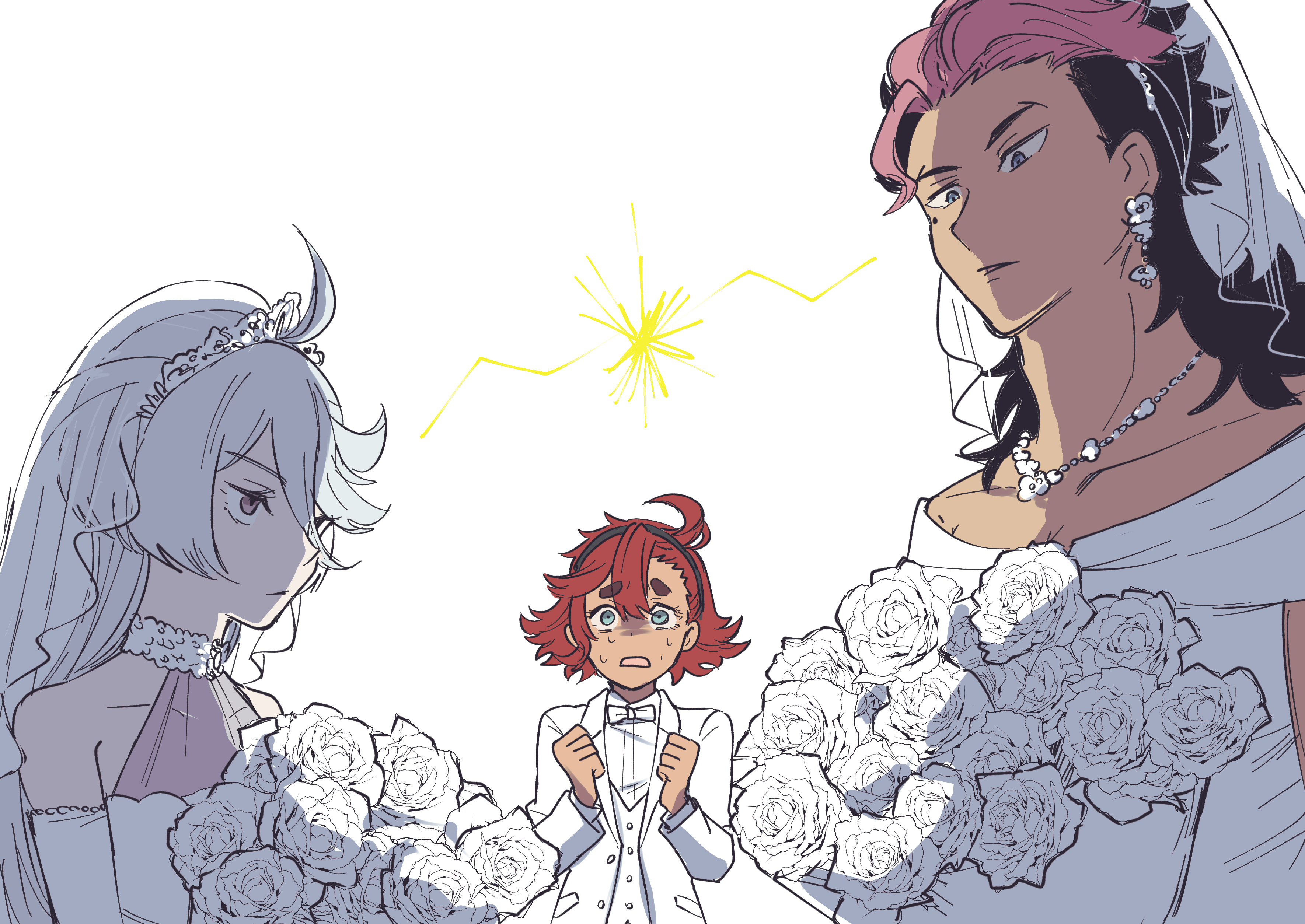 1boy 2girls absurdres ahoge black_hair bouquet bride crossdressing dress earrings flower formal_clothes guel_jeturk gundam gundam_suisei_no_majo hairband highres jewelry love_triangle mineo406 miorine_rembran mole mole_under_eye multicolored_hair multiple_girls pink_hair red_hair suit suletta_mercury two-tone_hair veil wedding_dress white_background white_hair white_suit