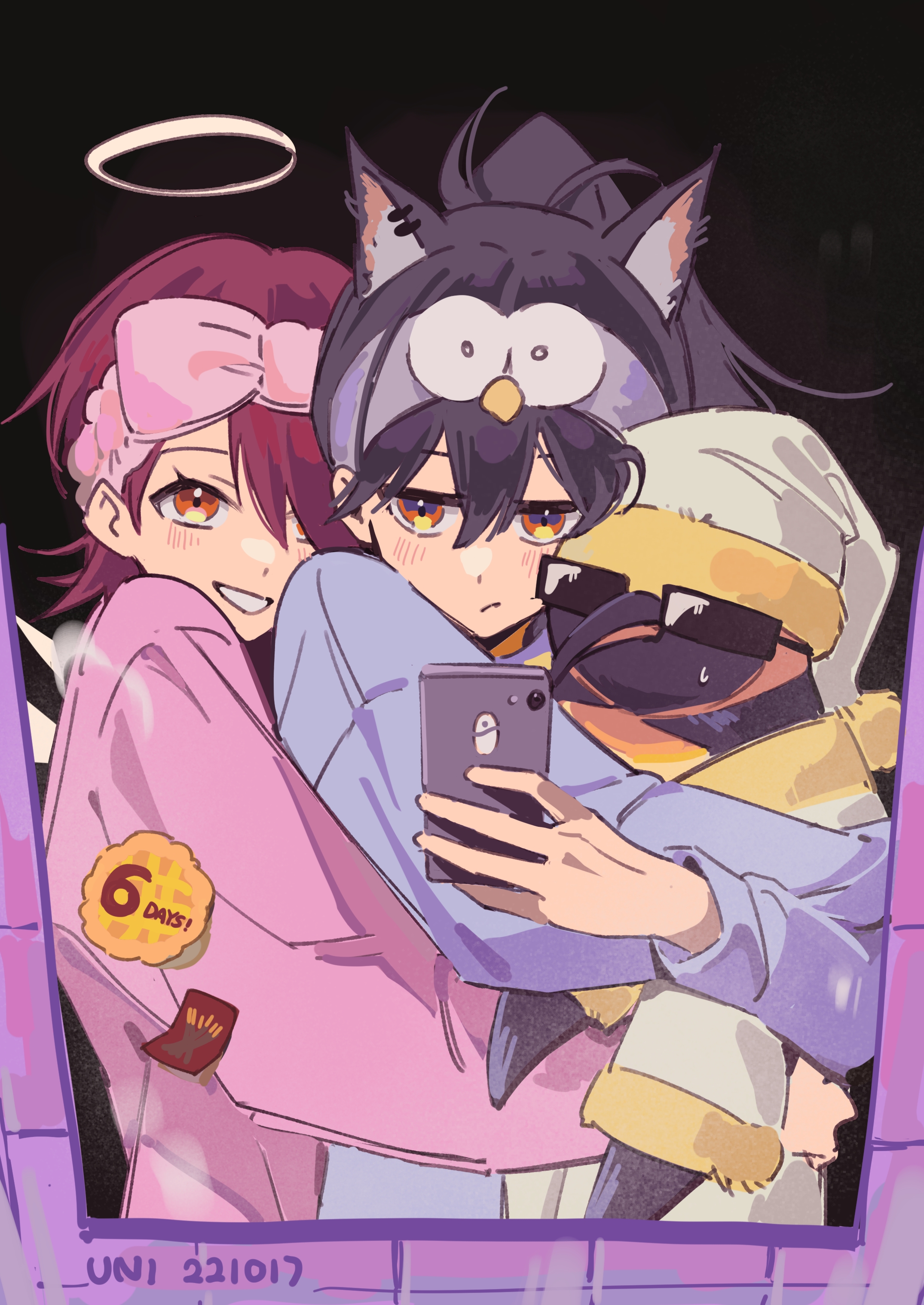 2girls absurdres animal_ears arknights black_hair blue_sweater cellphone detached_wings energy_wings extra_ears exusiai_(arknights) haidan_uniiii hair_between_eyes hairband halo highres holding holding_phone holding_stuffed_toy hug hug_from_behind light_blush long_hair long_sleeves multiple_girls pajamas penguin_logistics_logo phone photo-referenced pink_hairband pink_sweater red_eyes red_hair selfie short_hair smartphone smile stuffed_animal stuffed_penguin stuffed_toy sweater texas_(arknights) emperor_(arknights) wings wolf_ears wolf_girl yuri