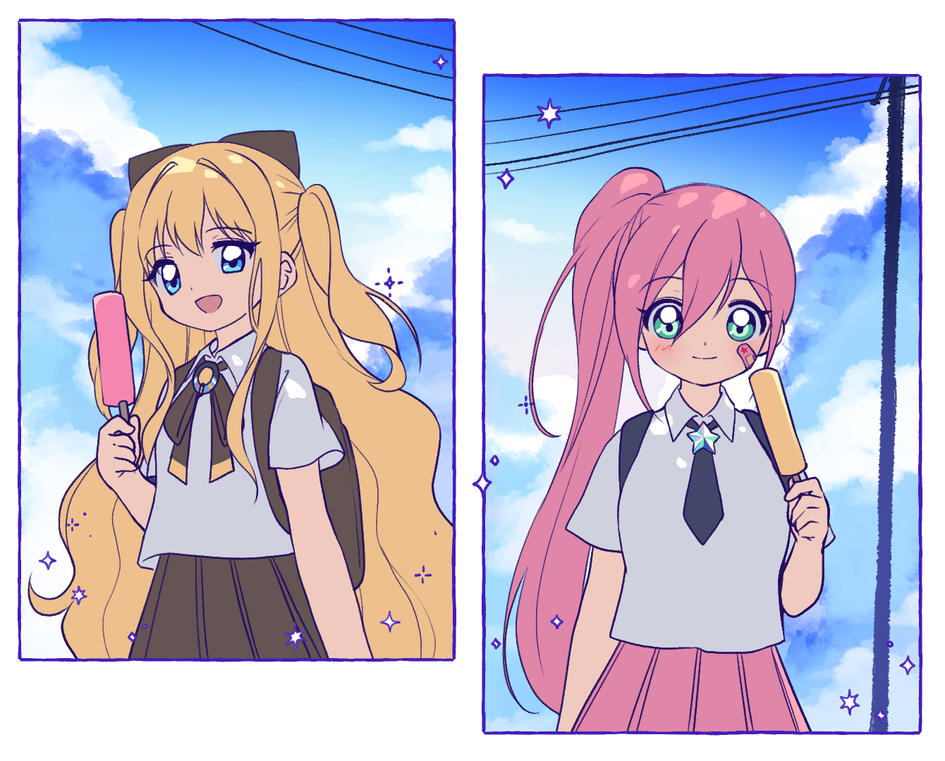 2girls :d backpack bag bandaid bandaid_on_cheek bandaid_on_face black_necktie black_skirt blonde_hair blue_sky blush breasts closed_mouth cloud cloudy_sky collared_shirt day food green_eyes hair_between_eyes headgear holding holding_food long_hair mechuragi multicolored_hair multiple_girls necktie open_mouth outdoors pink_hair pink_skirt pleated_skirt popsicle power_lines seeu shirt short_sleeves side_ponytail skirt sky small_breasts smile star_(symbol) two-tone_hair uni_(vocaloid) utility_pole very_long_hair vocaloid white_shirt