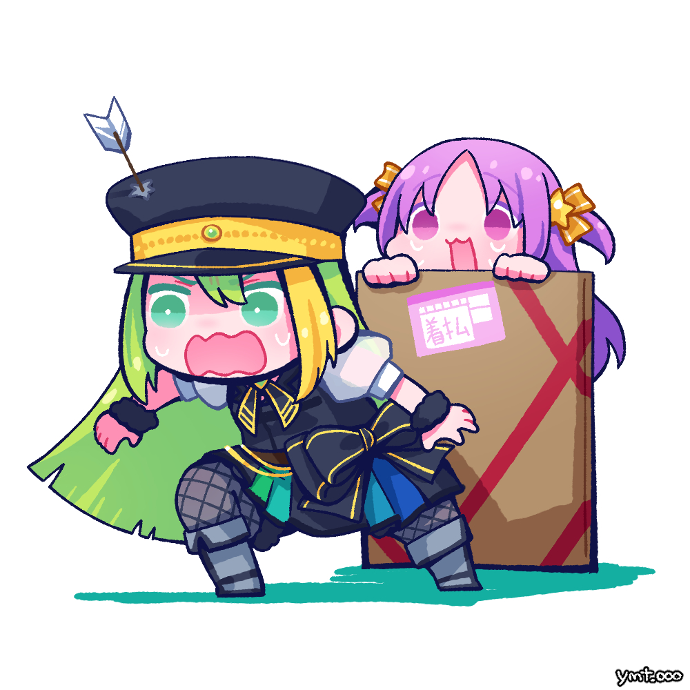 2girls alina_gray black_bow black_footwear black_headwear black_necktie black_vest blunt_ends blush boots bow brooch chain chibi collar cross_tie detached_collar fishnet_thighhighs fishnets fold-over_boots fur_cuffs gem green_gem green_hair hair_between_eyes hair_ornament hat inui_yamato jewelry long_hair magia_record:_mahou_shoujo_madoka_magica_gaiden magical_girl mahou_shoujo_madoka_magica medium_hair miniskirt misono_karin multicolored_hair multicolored_skirt multiple_girls necktie parted_bangs parted_hair peaked_cap pleated_skirt puffy_short_sleeves puffy_sleeves purple_eyes purple_hair ribbon see-through_clothes see-through_sleeves short_sleeves sidelocks skirt sleeve_cuffs star_(symbol) straight_hair streaked_hair striped_clothes striped_skirt thighhighs two_side_up v-neck vertical-striped_clothes vertical-striped_skirt very_long_hair vest waist_bow white_collar white_sleeves