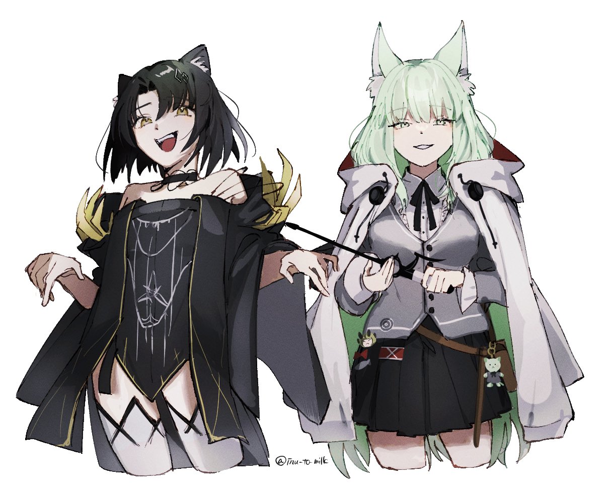 2girls :d animal_ear_fluff animal_ears arknights bare_shoulders black_dress black_hair black_ribbon black_skirt breasts cape cat_ears cat_girl character_charm character_doll charm_(object) collared_shirt cowboy_shot cropped_legs doll dress grey_vest hands_up harmonie_(arknights) hood hood_down hooded_cape inu_to_milk looking_at_viewer mandragora_(arknights) medium_hair multiple_girls neck_ribbon open_mouth parted_lips pleated_skirt reed_(arknights) ribbon shirt short_hair simple_background skirt small_breasts smile strapless strapless_dress teeth upper_teeth_only vest white_background white_cape white_shirt yellow_eyes