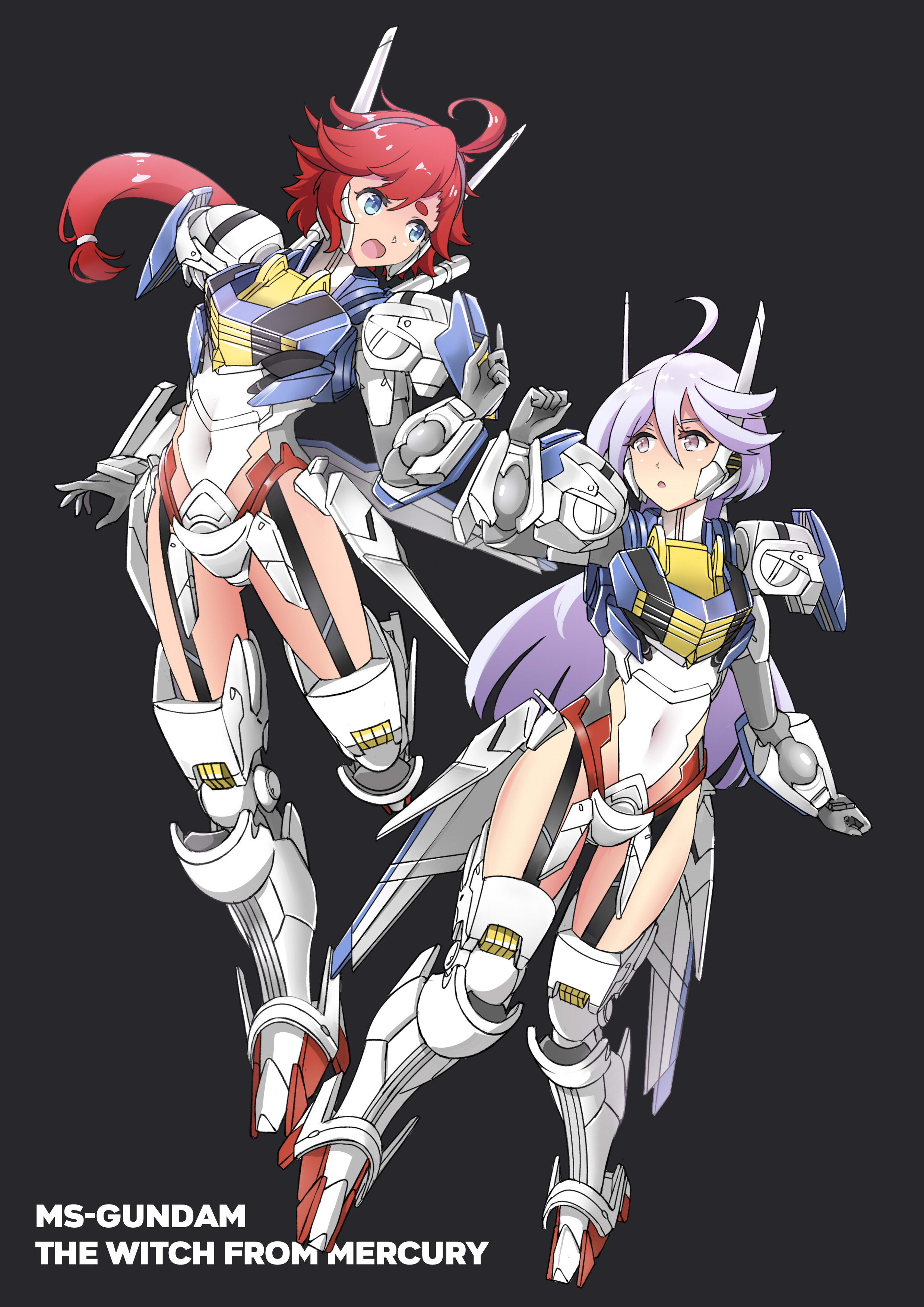 2girls absurdres ahoge armor black_background blue_eyes commentary cosplay english_commentary grey_eyes gundam gundam_aerial gundam_aerial_(cosplay) gundam_suisei_no_majo hairband highres long_hair low_ponytail mecha_musume miorine_rembran multiple_girls ponytail red_hair sudhiro_sappurisa suletta_mercury white_hair
