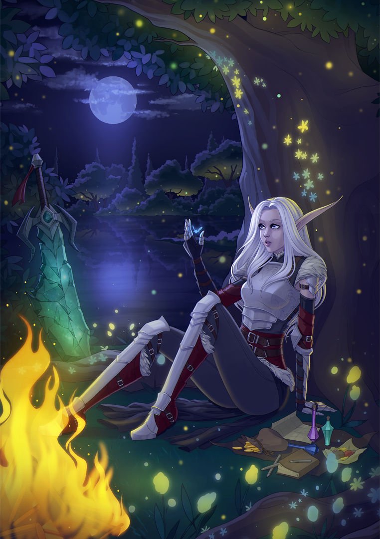 armor campfire colored_skin elf forest full_moon long_pointy_ears moon nature night night_elf_(warcraft) player_character_(wow) pointy_ears purple_skin sienna_artwork sky warcraft white_hair world_of_warcraft