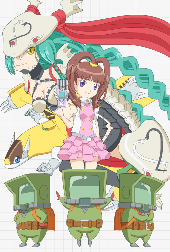 amano_nene_(digimon_xros_wars) brown_hair digimon long_hair mervamon monitamon purple_eyes snake sparrowmon twintails