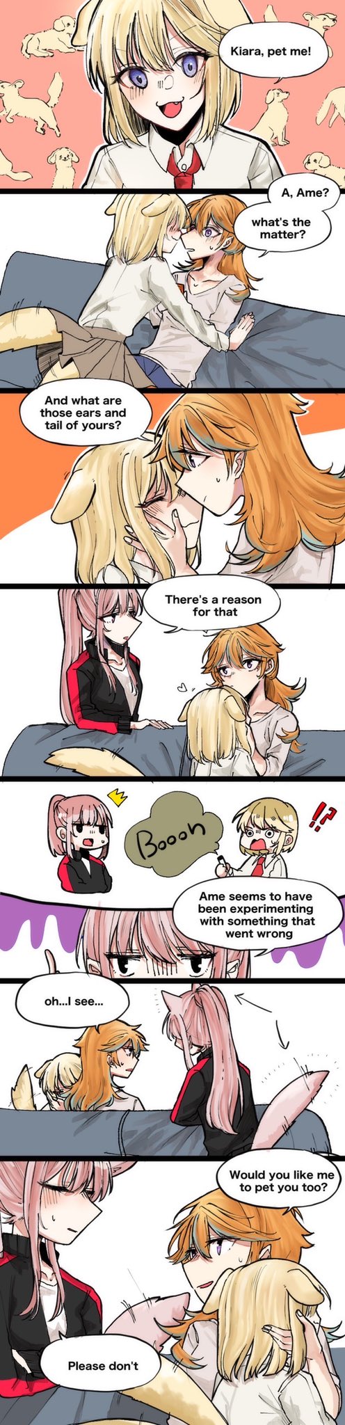 animal_ears blonde_hair blue_eyes couch dog dog_ears dog_girl dog_tail english_text hair_ornament highres hololive hololive_english kiss long_hair long_image mori_calliope multicolored_hair multiple_girls necktie orange_hair pink_hair ponytail shirt short_hair sitting skirt sukebeningn tail tail_wagging takanashi_kiara tall_image virtual_youtuber watson_amelia white_shirt yuri