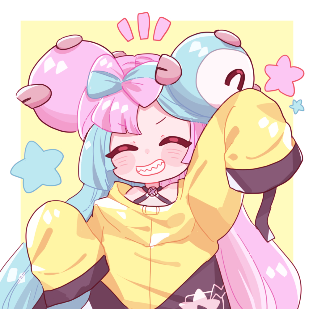 1girl ^_^ aqua_hair arm_up bad_id bad_pixiv_id bare_shoulders black_jacket blush_stickers bow-shaped_hair character_hair_ornament chibi clenched_teeth closed_eyes gen_1_pokemon grey_shirt hair_ornament iono_(pokemon) jacket komoko_(komokonov_pm) long_sleeves magnemite multicolored_hair multicolored_jacket nintendo outside_border oversized_clothes pink_hair pokemon pokemon_scarlet_and_violet sharp_teeth shirt sleeveless sleeveless_shirt sleeves_past_fingers sleeves_past_wrists solo split-color_hair star_(symbol) teeth two-tone_background two-tone_hair two-tone_jacket v v-shaped_eyebrows white_background x_(symbol) yellow_background yellow_jacket