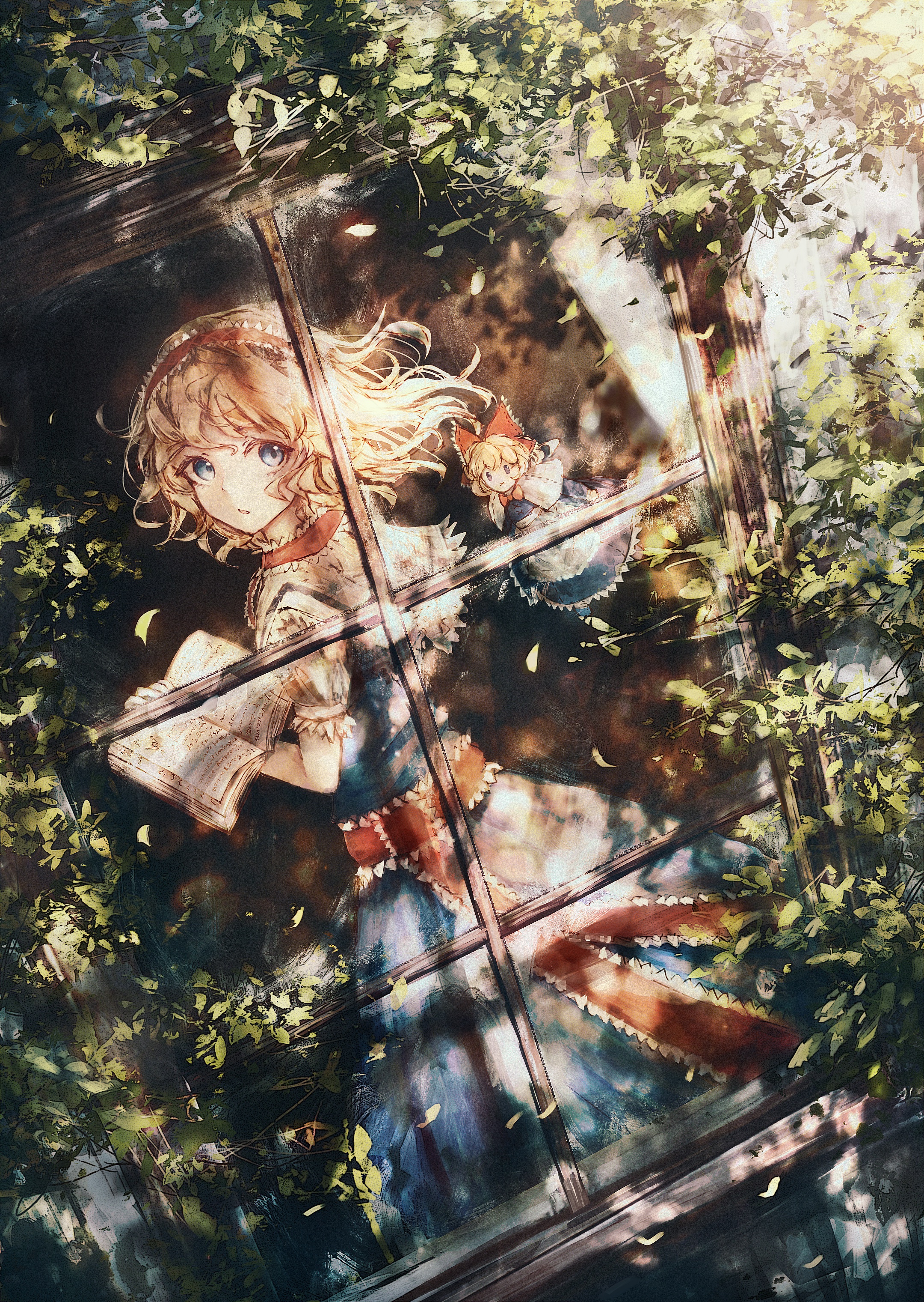 1girl x_mouth absurdres alice_margatroid apron blonde_hair blue_dress blue_eyes book bow capelet commentary dress dutch_angle hair_bow hairband highres holding holding_book looking_at_viewer open_book open_mouth plant red_hairband red_ribbon ribbon shanghai_doll shirt short_sleeves tonan_(l0l0l0l0l0l) touhou white_apron white_capelet white_shirt window