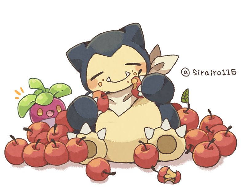 animal_focus apple apple_core artist_name bandana blank_eyes blush blush_stickers bounsweet claws closed_mouth clothed_pokemon crumbs eating fangs fangs_out food food_bite food_on_face fruit full_body gen_1_pokemon gen_7_pokemon hands_up happy head_tilt holding_apple leaf looking_at_another nintendo no_humans notice_lines open_mouth pawpads pokemon pokemon_(creature) shira_(sirairo116) signature simple_background sitting smile snorlax solo_focus straight-on twitter_username white_background white_bandana yellow_eyes