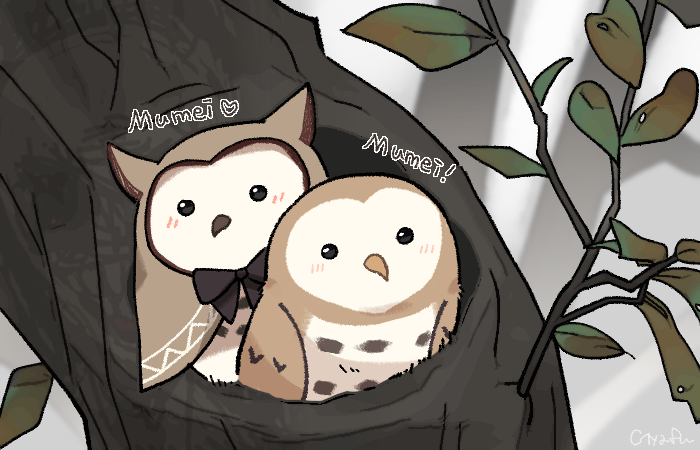 2others animal_focus beak bird blush branch brown_capelet capelet dot_pupils ears_through_headwear forest gyaheung heart hololive hololive_english hooman_(nanashi_mumei) leaf looking_at_viewer multiple_others nature nest owl ribbon tree virtual_youtuber