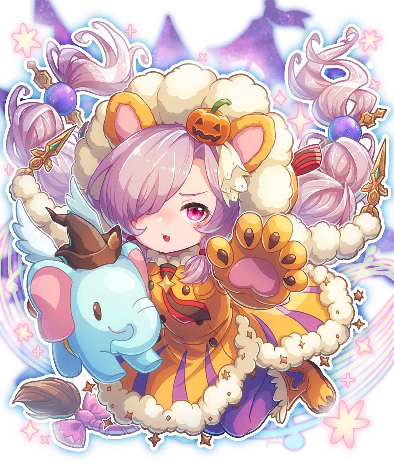 animal_costume animal_ears animal_hands bow dress gloves granblue_fantasy hair_ornament harvin highres jack-o'-lantern jack-o'-lantern_hair_ornament lion_costume lion_ears lion_tail niyon_(granblue_fantasy) niyon_(lejonskrik)_(granblue_fantasy) orange_dress pantyhose paw_gloves purple_pantyhose purple_ribbon ribbon striped_ribbon tail tail_bow tail_ornament yuiko_(yuiyuiko_108)