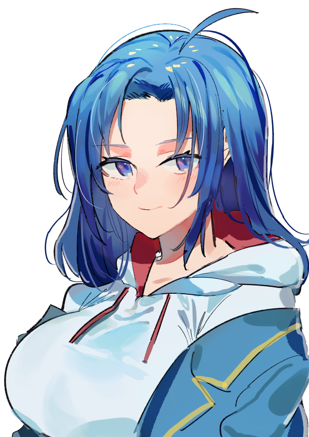 1girl ahoge alternate_hairstyle blazer blue_eyes blue_hair blush breasts hood hoodie jacket large_breasts long_hair looking_at_viewer loose_clothes magicami ohtori_ao saidasai school_uniform sidelocks smile white_hoodie