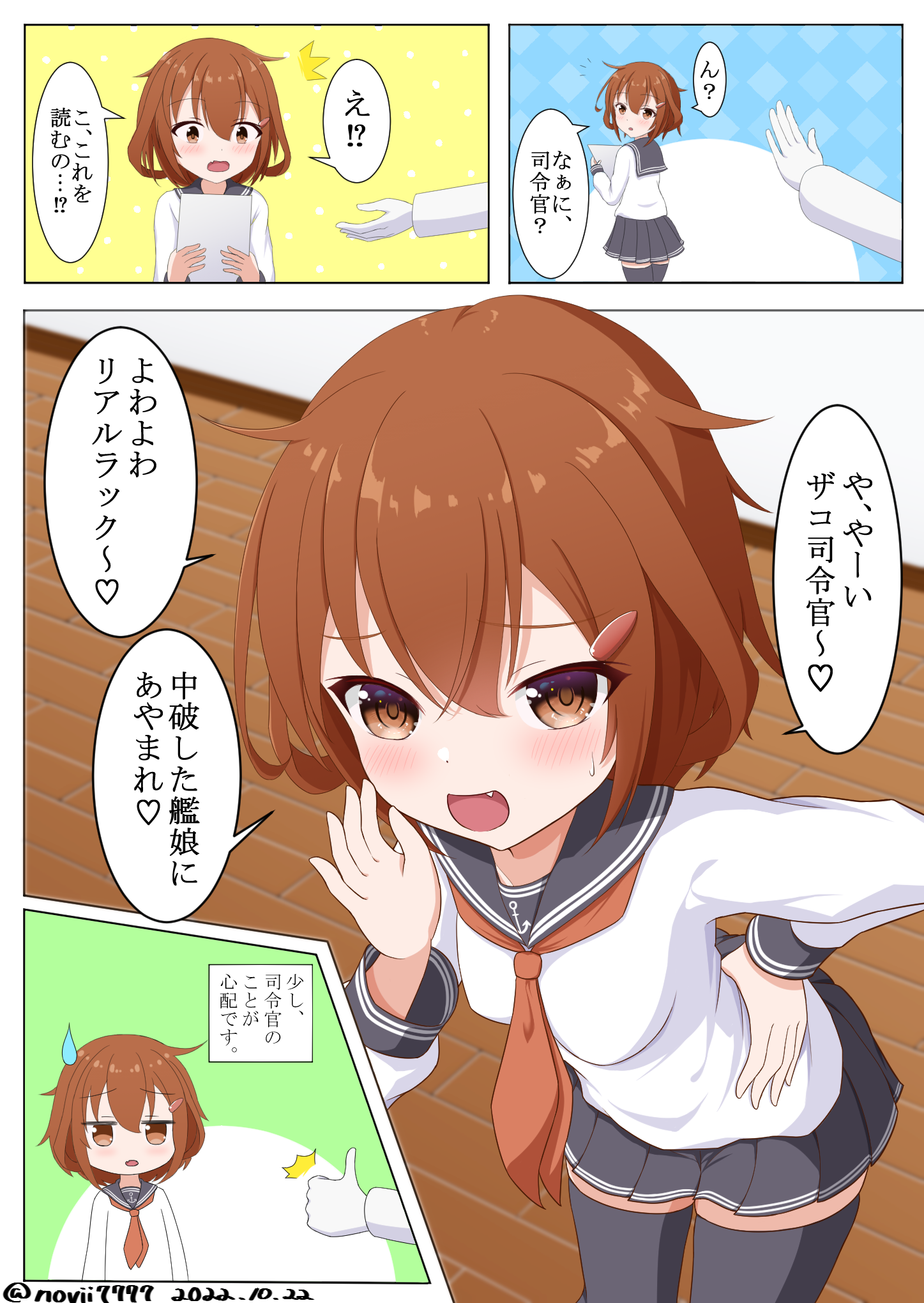 breasts brown_eyes brown_hair comic fang hair_ornament hairclip hand_on_own_hip high_heels highres ikazuchi_(kancolle) kantai_collection long_sleeves messy_hair neckerchief no._vii red_neckerchief school_uniform serafuku shirt short_hair skirt small_breasts tight_clothes tight_shirt translation_request
