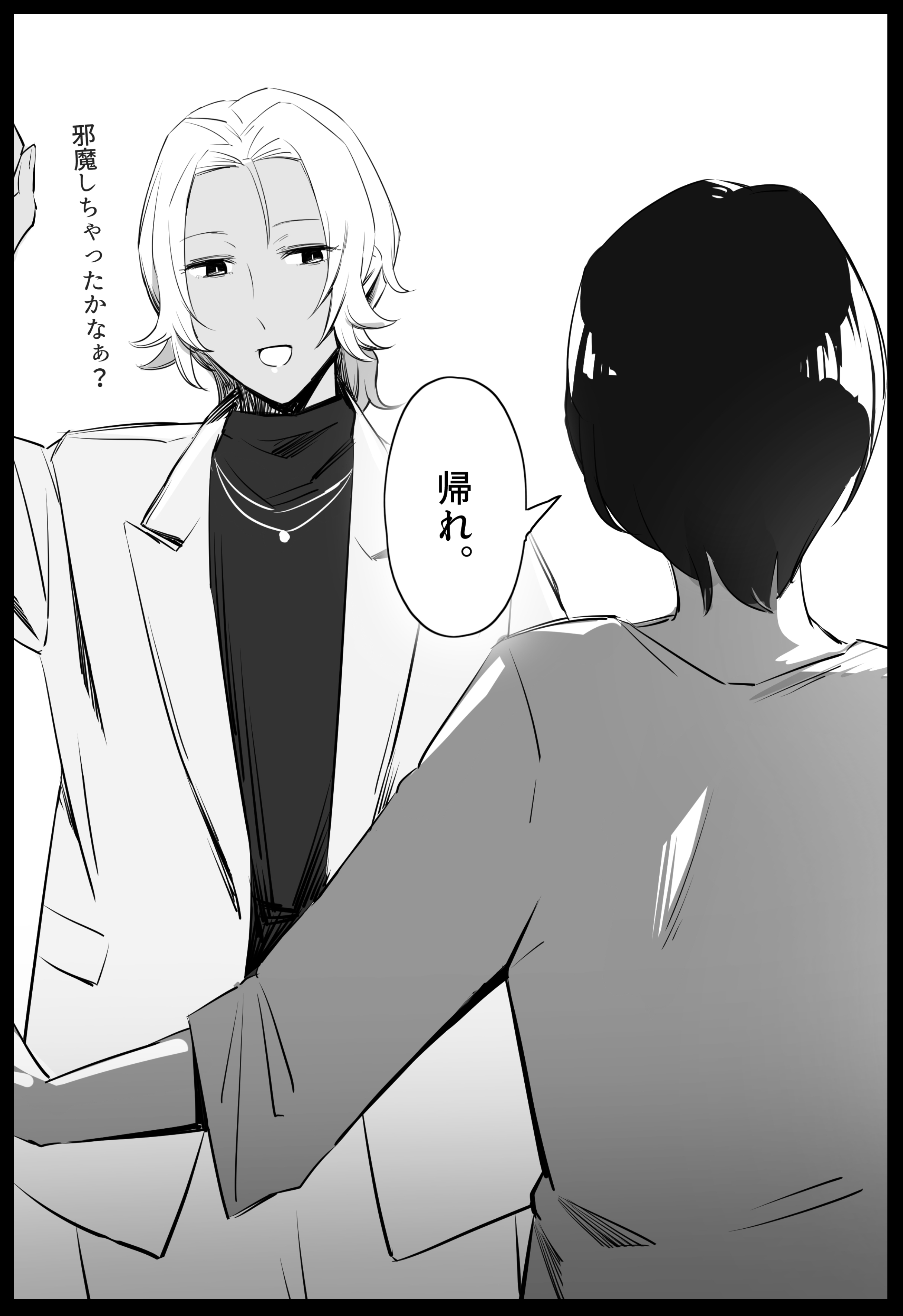 2girls absurdres alternate_costume catherine_(fire_emblem) comic commentary_request contemporary fire_emblem fire_emblem:_three_houses forehead from_behind furo_atsushi greyscale highres jacket jewelry looking_at_viewer monochrome multiple_girls necklace nintendo open_clothes open_jacket open_mouth ponytail shamir_nevrand shirt short_hair speech_bubble translation_request